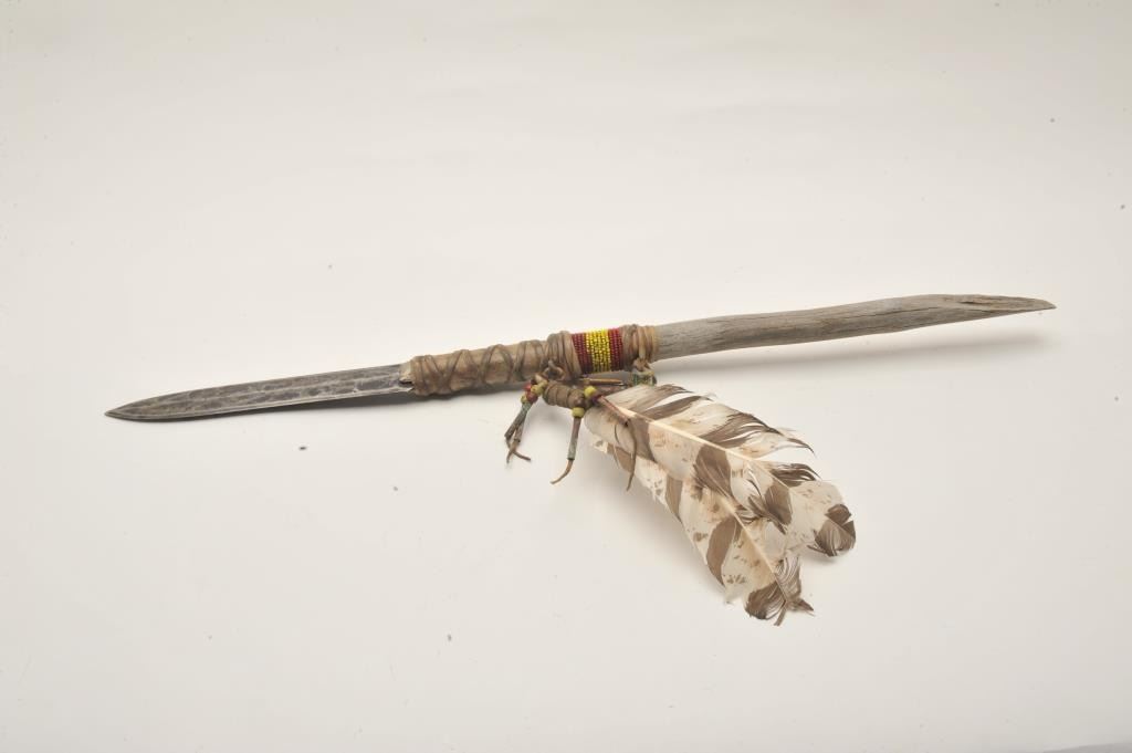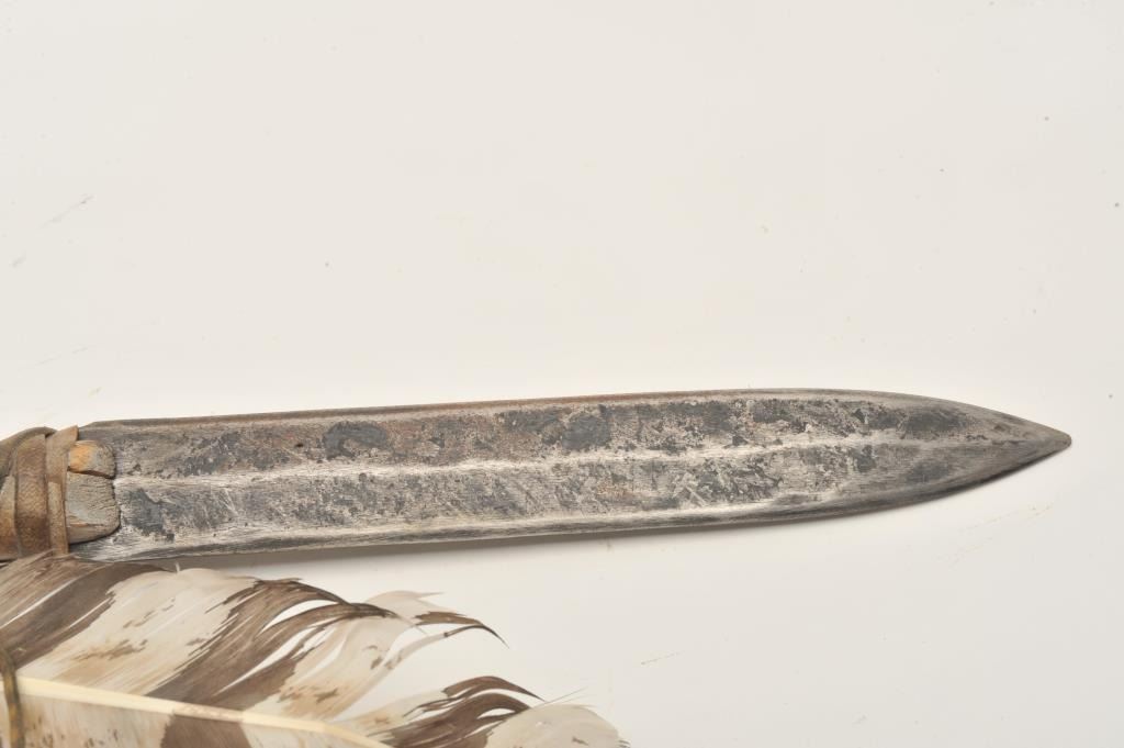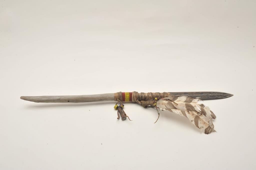 Lot 1398 18AP-53 SPEARiron ceremonial Indian spear with wood shaft and beaded decoration, turkey feathers,