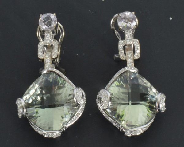 Matching necklace sold in separate lot. With appraisal: "One pair of 18kt white gold green amethyst, white sapphire and diamond earrings. The earrings contain two (2) cushion cut green amethysts, two (2) round