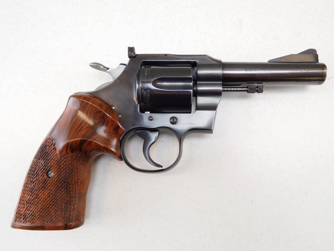 GOOD BORE, DOUBLE ACTION, ADJUSTABLE TARGET SIGHTS, LOCKS UP AND INDEXES WELL, FITZ GUN FIGHTER PLASTI CHECKERED GRIPS , BARREL LENGTH: 102MM , SERIAL: 72274 , ACTION: REVOLVER , CONDITION: 8/10 , STOCK # P1834 , CLASS: CANADIAN PROHIBITED CLASS