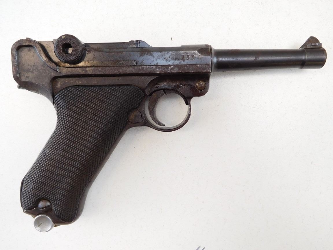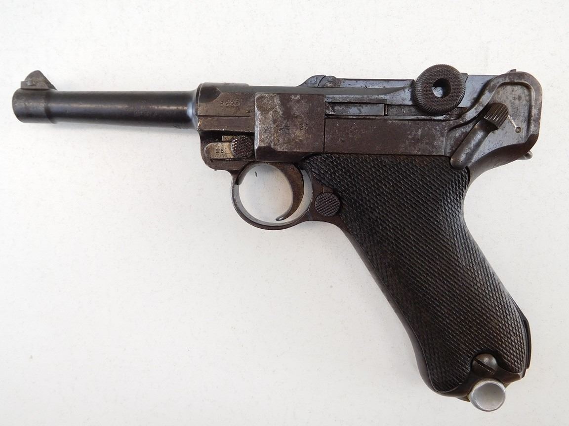 COMES WITH MAGAZINE, MANUFACTURED BY DWM, DATED 1916, WAFFEN MARKS,NUMBERS MATCH ON EVERYTHING EXCEPT THE MAGAZINE, CHECKERED WOODEN GRIPS, NOTCH AND BLADE SIGHTS, GOOD BORE, THE FRAME IS PITTED , BARREL LENGTH: 102MM , SERIAL: 6225N , ACTION: SEMIAUTOMATIC HANDGUN , CONDITION: 4/10 , STOCK # P1836 , CLASS: CANADIAN PROHIBITED CLASS