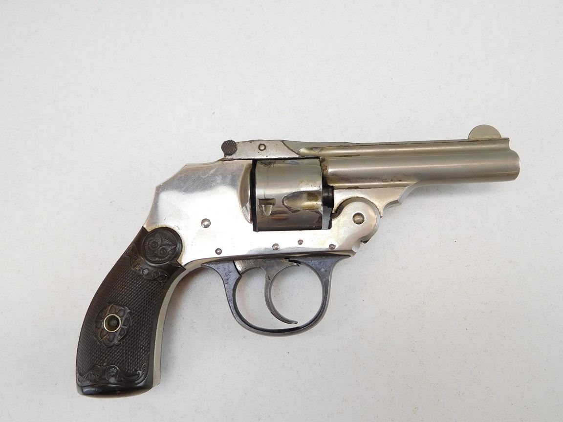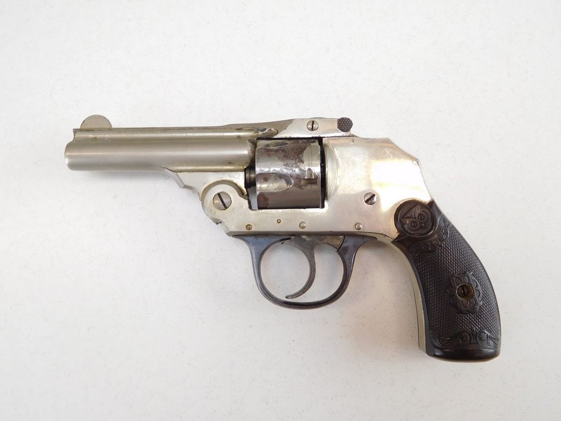 5 SHOTS, HARD RUBBER CHECKERED GRIPS, NICKEL PLATED, INDEXES AND FIRES , BARREL LENGTH: 76MM , SERIAL: B87392 , ACTION: REVOLVER , CONDITION: 5/10 , STOCK # P1852 , CLASS: CANADIAN PROHIBITED CLASS