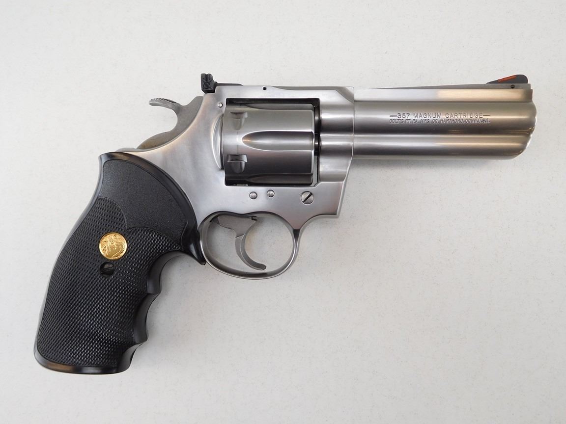 COMES WITH HOLSTER AND PAPERWORK, 6 SHOT CAPACITY, STAINLESS STEEL, ORIGINAL COLT PACHMAYR GRIPS, GRIPS HAVE COLT MEDALION, COMES WITH INSTRUCTION MANUAL, ADJUSTABLE TARGET SIGHTS, DOUBLE ACTION, INDEXES, LOCKS UP WELL, EXCELLENT BORE , BARREL LENGTH: 102MM , SERIAL: KC8750 , ACTION: REVOLVER , CONDITION: 9/10 , STOCK # P1854 , CLASS: CANADIAN PROHIBITED CLASS