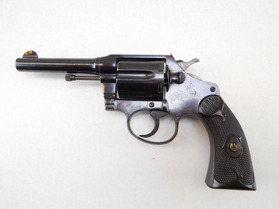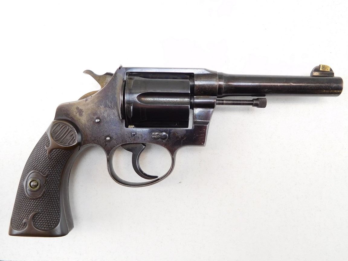 MADE FROM 1907- 1923 SERIAL # DATES IT AT 1915, ORIGINAL GRIPS, BRASS FRONT AND REAR SIGHTS ARE HOMEMADE BUT CAN BE REMOVED, DOUBLE ACTION, INDEXES WELL, GOOD BORE , BARREL LENGTH: 102MM , SERIAL: 119390 , ACTION: REVOLVER , CONDITION: 7/10 , STOCK # P1857 , CLASS: CANADIAN PROHIBITED CLASS