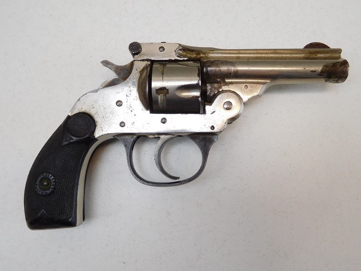 5 SHOT CAPACITY, NOTCH AND BLADE SIGHTS, HARD RUBBER GRIPS, NICKEL FINISH , BARREL LENGTH: 76MM , SERIAL: 319259 , ACTION: REVOLVER , CONDITION: 5/10 , STOCK # P1866 , CLASS: CANADIAN PROHIBITED CLASS