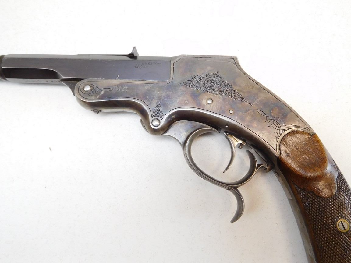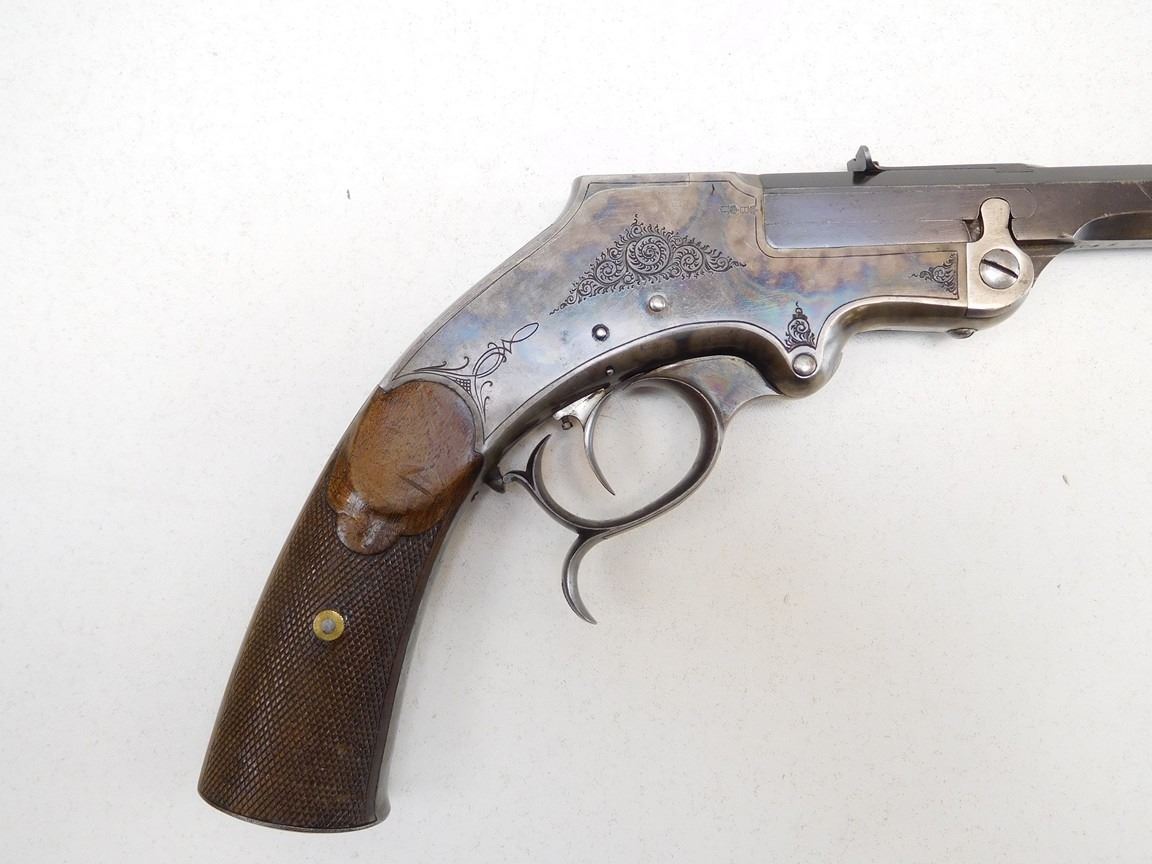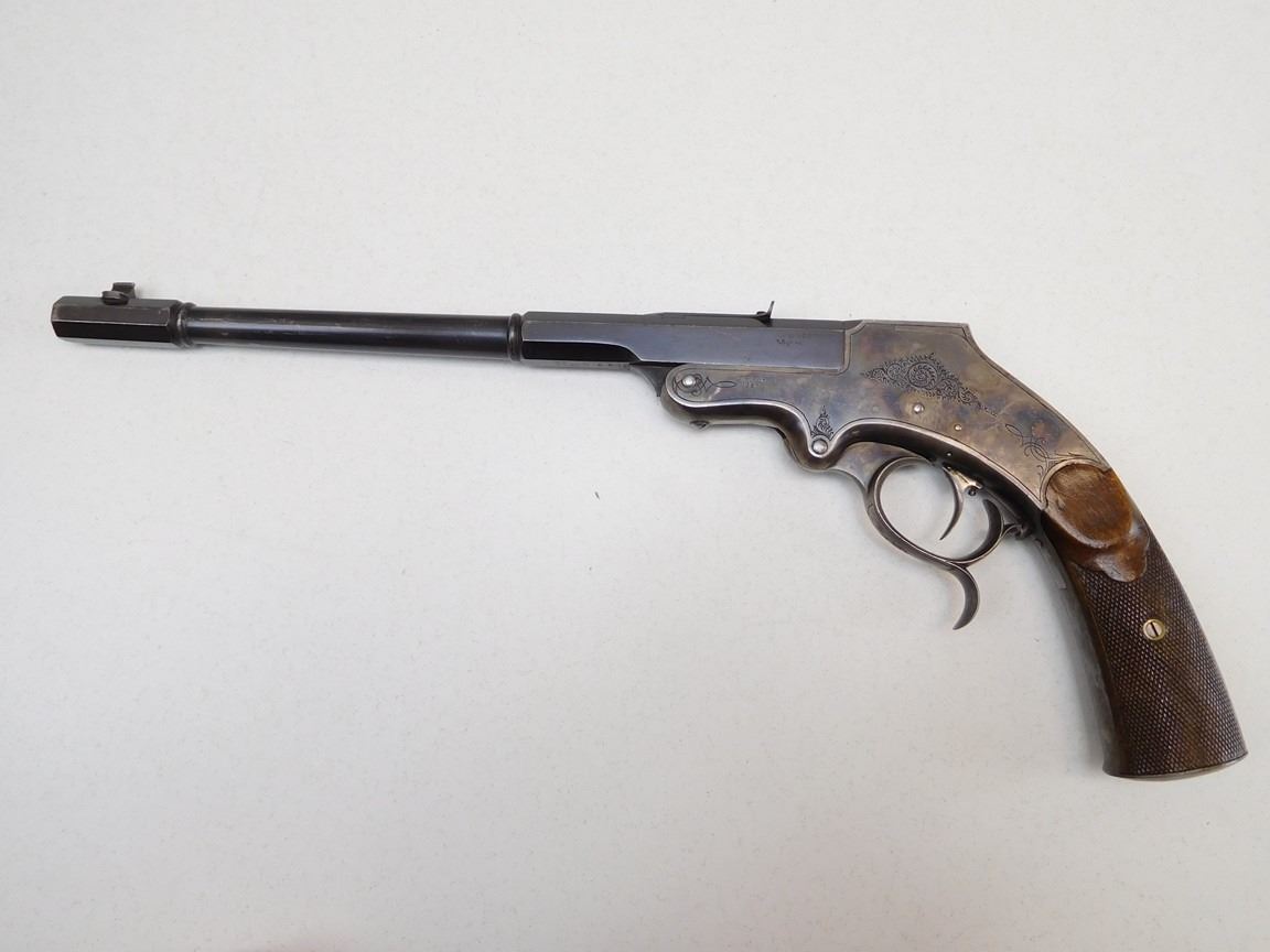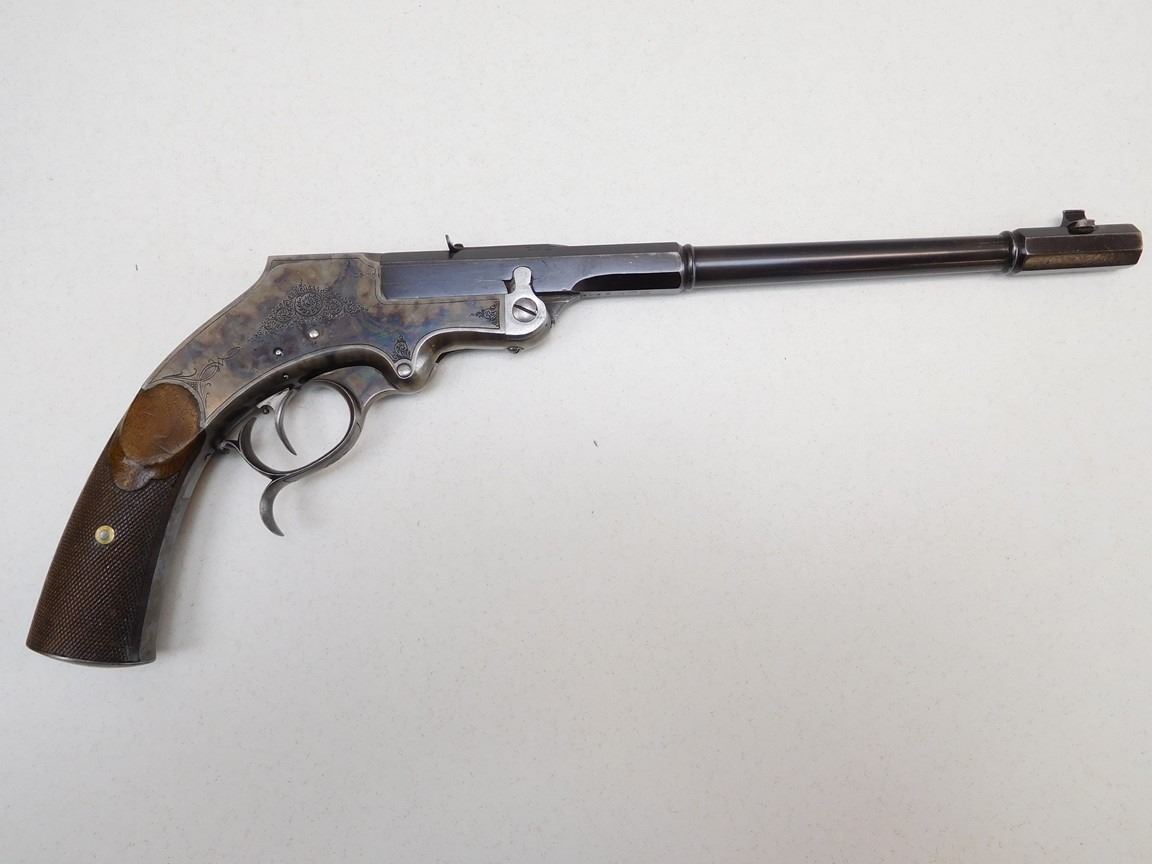CASE COLOURED ENGRAVED RECEIVER, CHECKERED PISTOL GRIP, OCTAGONAL AND ROUND BARREL, ADJUSTABLE METAL SIGHTS, GOOD BORE , BARREL LENGTH: 275MM , SERIAL: 4038 , ACTION: SINGLE SHOT BREAK ACTION PISTOL , CONDITION: 8/10 , STOCK # R2478 , CLASS: CANADIAN RESTRICTED CLASS