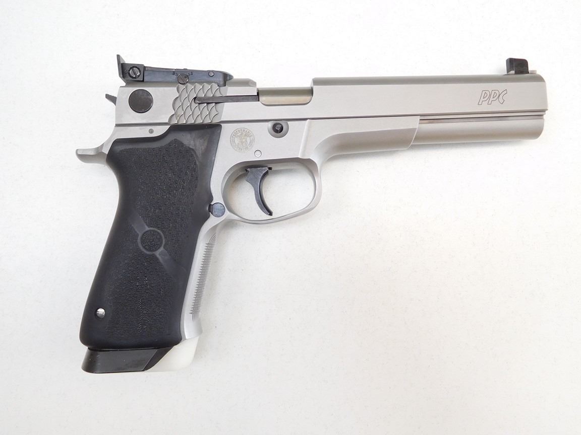 COMES WITH 2 MAGAZINES, THIS FIREARM IS FROM THE PERFORMANCE CENTER IN MASSACHUSETTS, THIS MAKES THIS A LIMITED EDITION AND HIGHLY SOUGHT AFTER, ADJUSTABLE ARISTOCRAT TARGET SIGHTS, HOGUE RUBER GRIPS, BRUSHED STAINLESS FINISH, FISH SCALE SERRATIONS ON SLIDE, BORE IS EXCELLENT, CONSIGNOR STATES THIS IS ONE OF THE MOST ACCURATE MODELS ON THE MARKET , BARREL LENGTH: 152MM , SERIAL: PPC0753 , ACTION: SEMIAUTOMATIC HANDGUN , CONDITION: 8/10 , STOCK # R2475 , CLASS: CANADIAN RESTRICTED CLASS