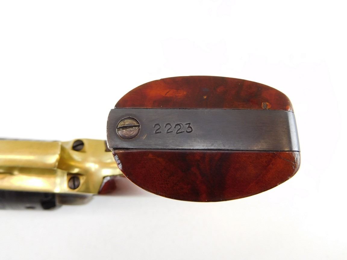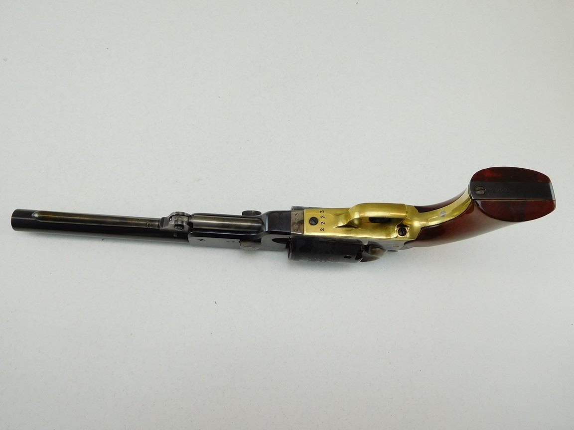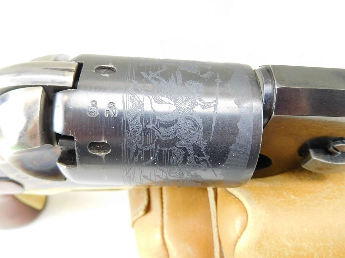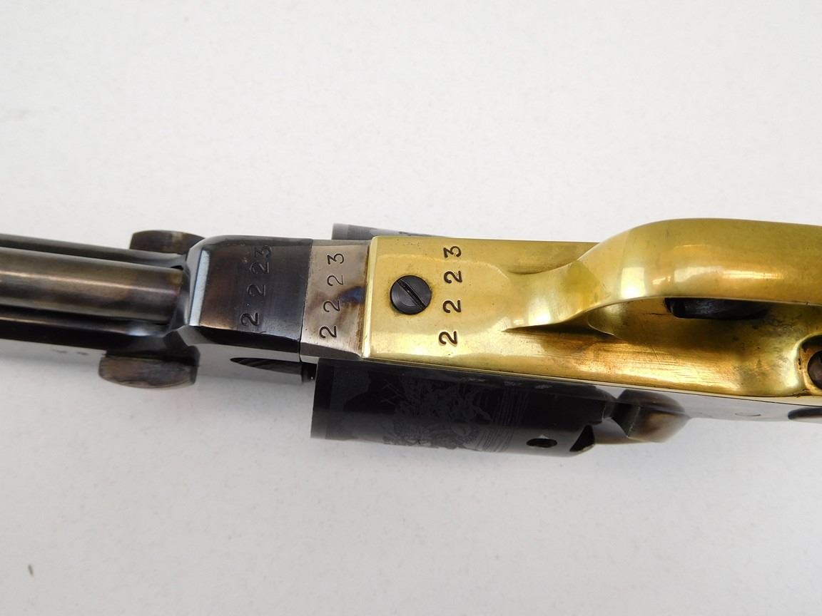 CASE COLOURED RECEIVER HAMMER TRIGGER, BRASS FURNITURE, WOODEN GRIPS, ENGRAVED COWBOY SCENE ON THE CYLINDER, NOTCH AND BLADE SIGHTS , BARREL LENGTH: 229MM , SERIAL: 2223 , ACTION: REVOLVER , CONDITION: 9/10 , STOCK # R2372 , CLASS: CANADIAN RESTRICTED CLASS