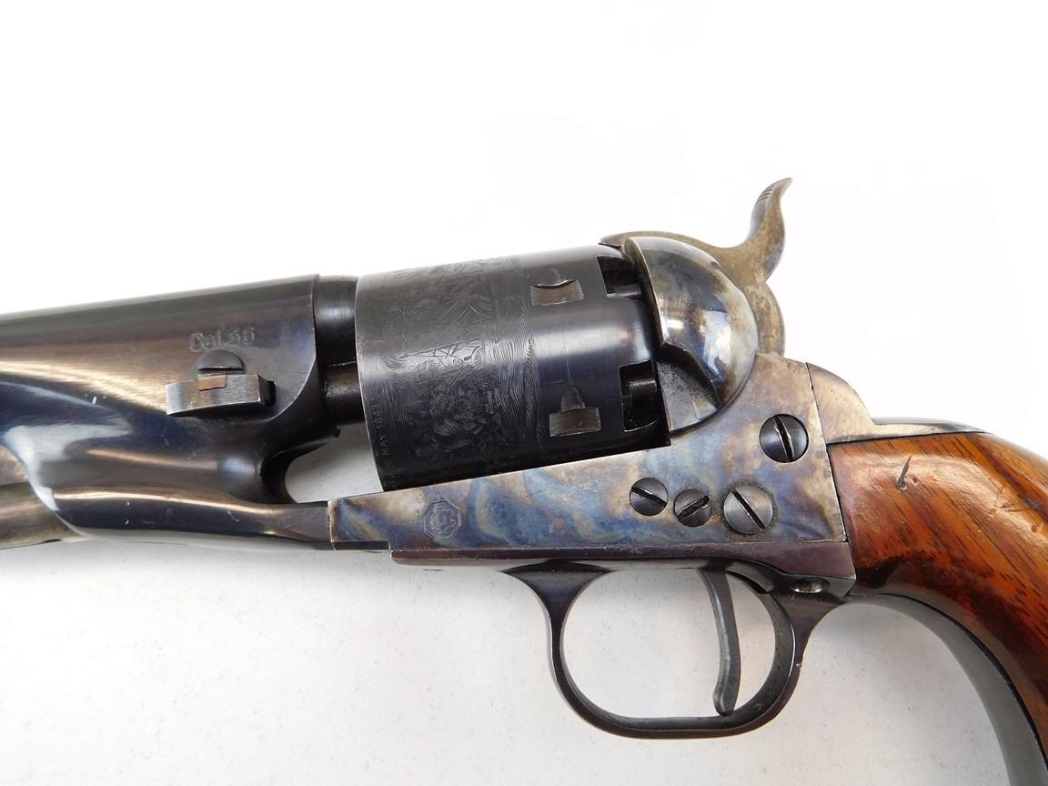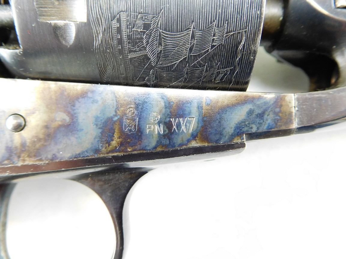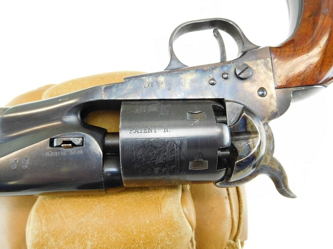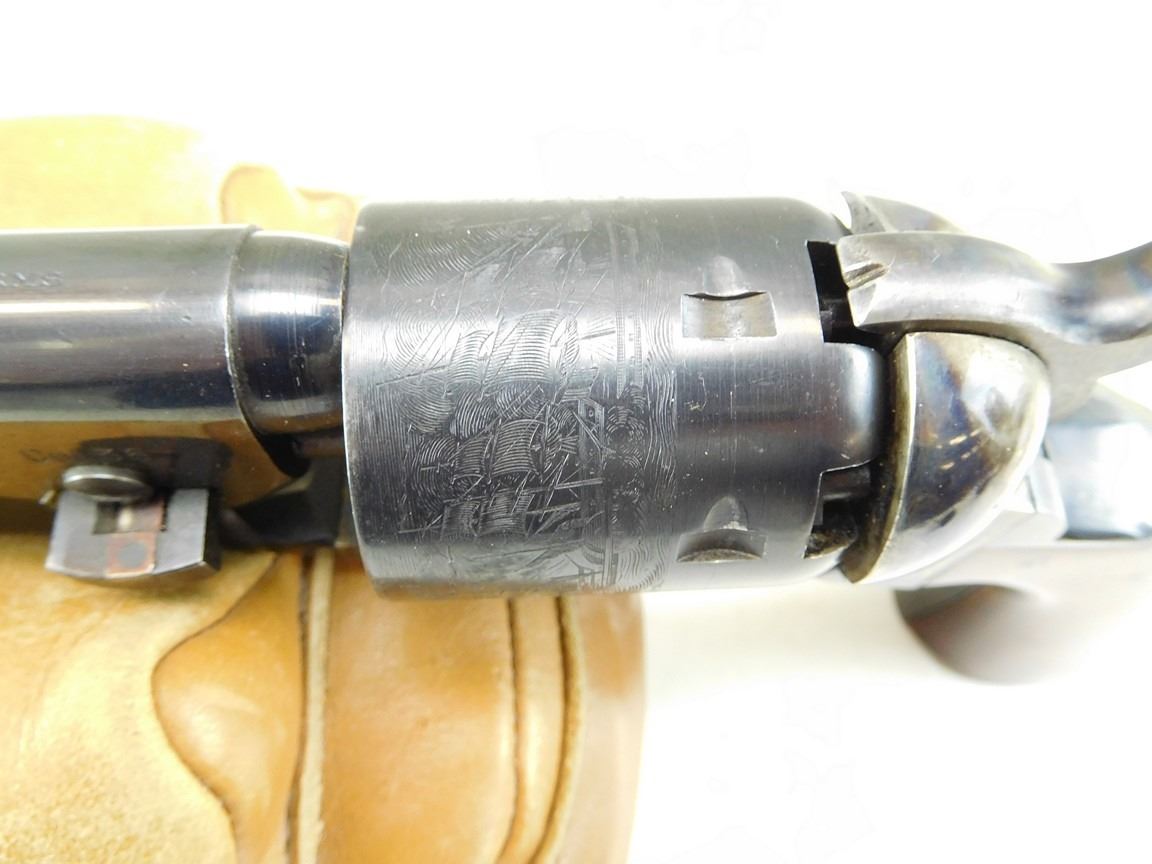 CASE COLOURED RECEIVER HAMMER AND LOADING ROD, WOODEN GRIPS, ROUND BARREL, NOTCH AND BLADE SIGHT, MANUFACTURED BY UBERTI, ENGRAVED NACAL SCENE ON THE CYLINDER , BARREL LENGTH: 190MM , SERIAL: N8733 , ACTION: REVOLVER , CONDITION: 9/10 , STOCK # R2375 , CLASS: CANADIAN RESTRICTED CLASS