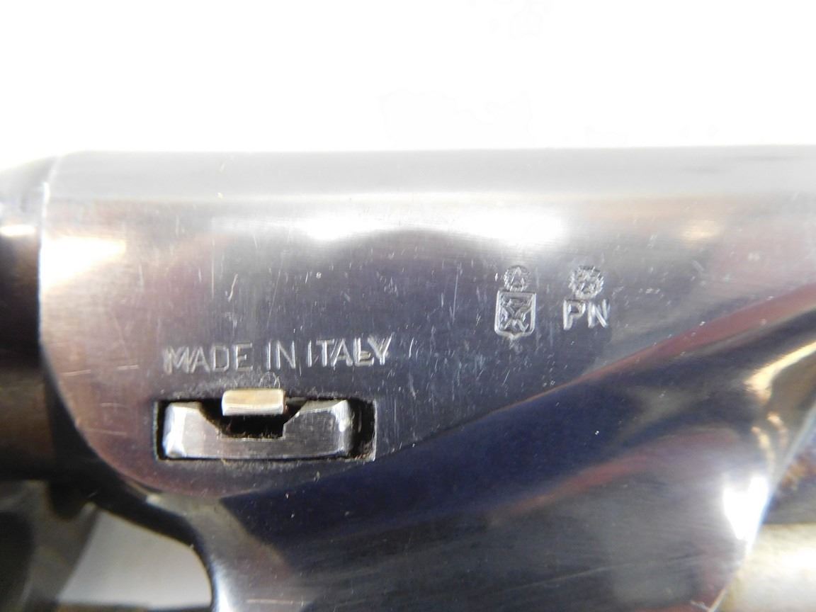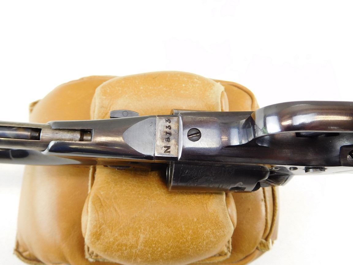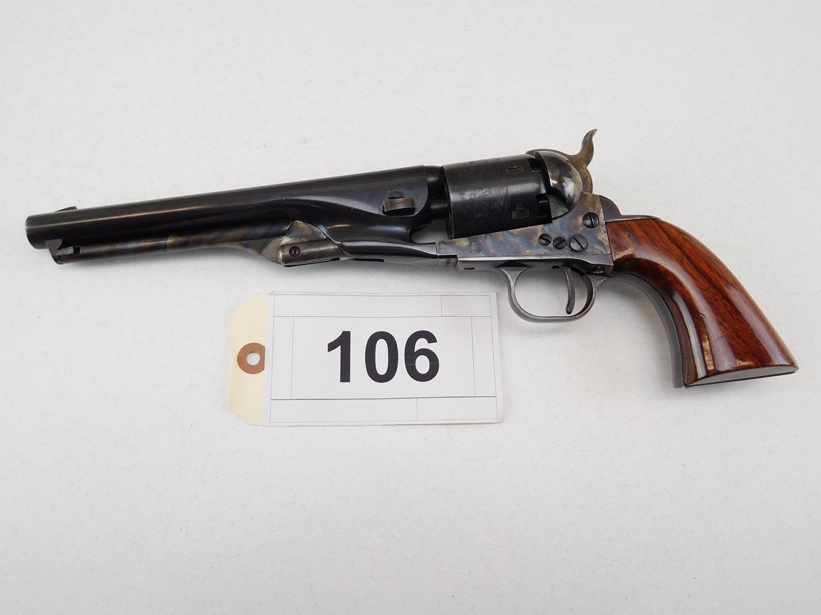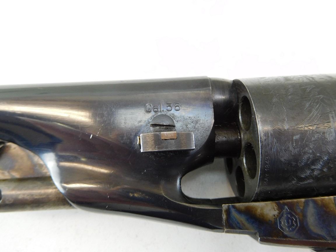 CASE COLOURED RECEIVER HAMMER AND LOADING ROD, WOODEN GRIPS, ROUND BARREL, NOTCH AND BLADE SIGHT, MANUFACTURED BY UBERTI, ENGRAVED NACAL SCENE ON THE CYLINDER , BARREL LENGTH: 190MM , SERIAL: N8733 , ACTION: REVOLVER , CONDITION: 9/10 , STOCK # R2375 , CLASS: CANADIAN RESTRICTED CLASS