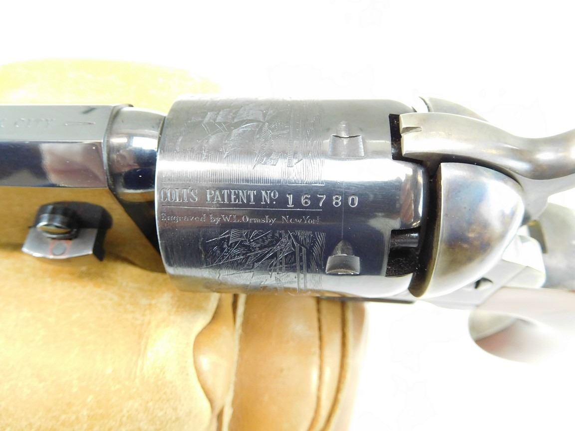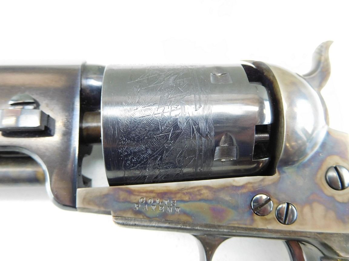 BARREL ADDRESS IS SAM L COLT NEW YORK CITY, CASE COLOURED FRAME LOADING ROD AND HAMMER, NICKEL PLATED GRIP STRAPS, ENGRAVED NAVAL BATTLE SCENE, NOTCH AND BEAD SIGHT , BARREL LENGTH: 191MM , SERIAL: 16780 , ACTION: REVOLVER , CONDITION: 9/10 , STOCK # R2376 , CLASS: CANADIAN RESTRICTED CLASS