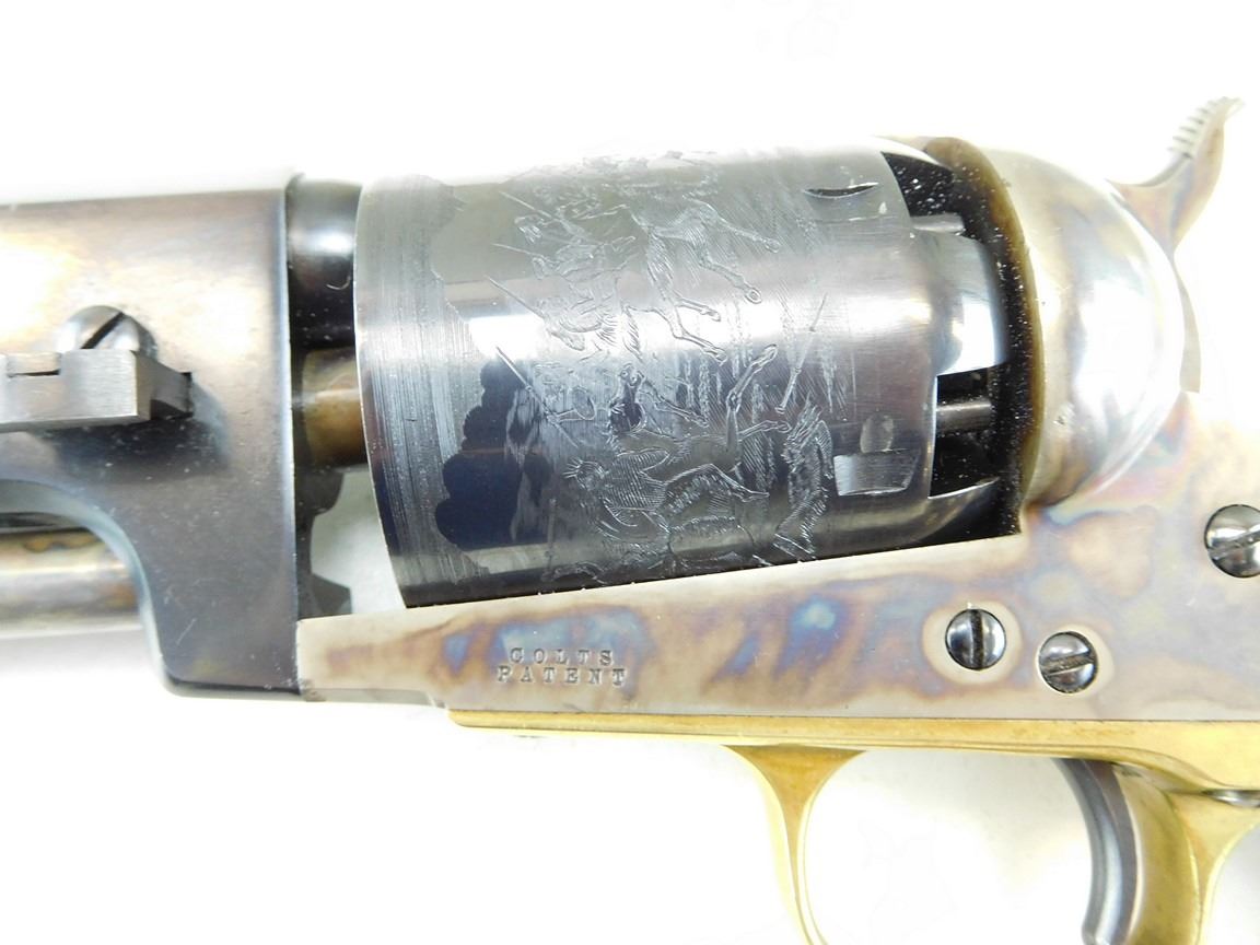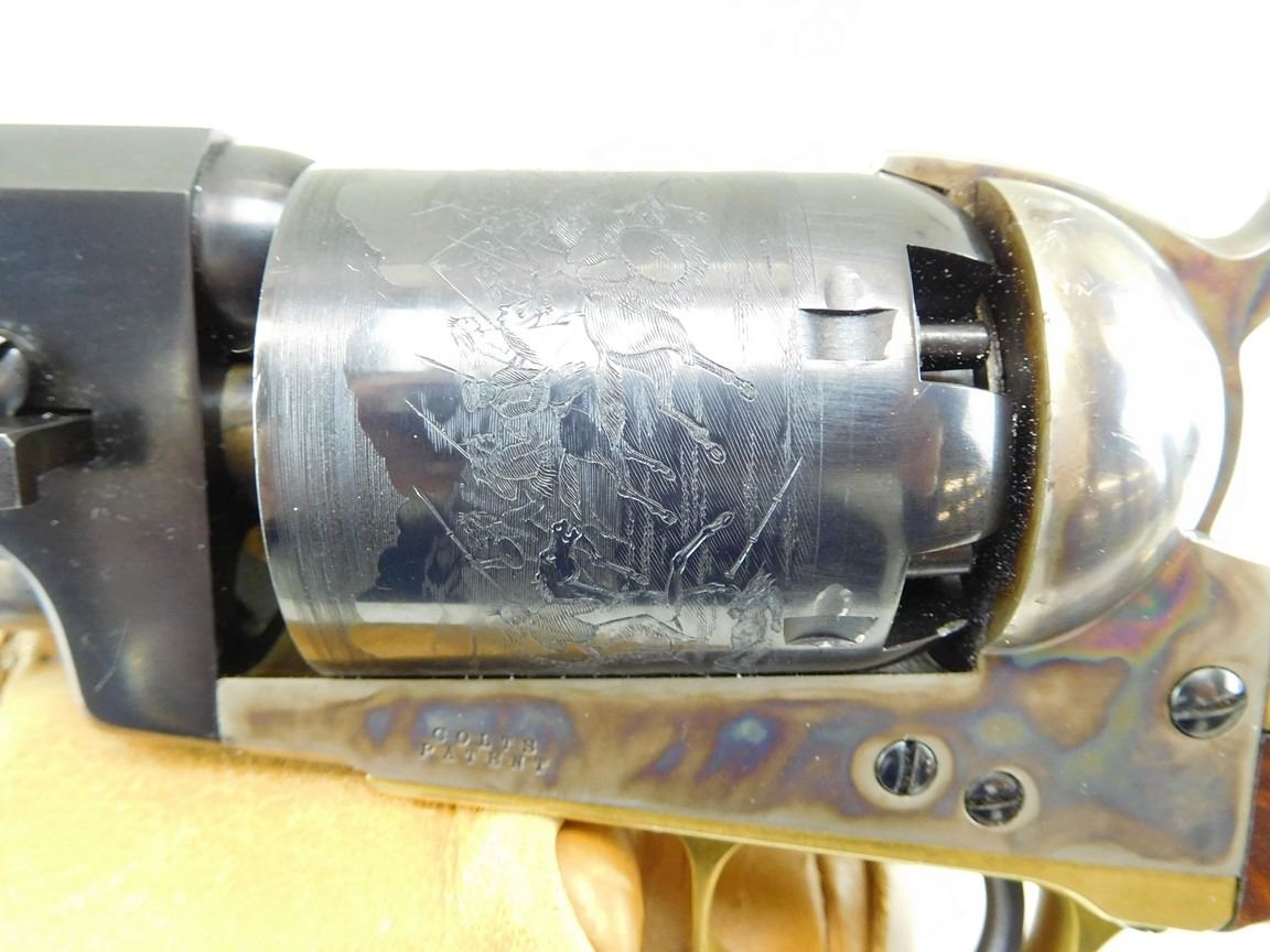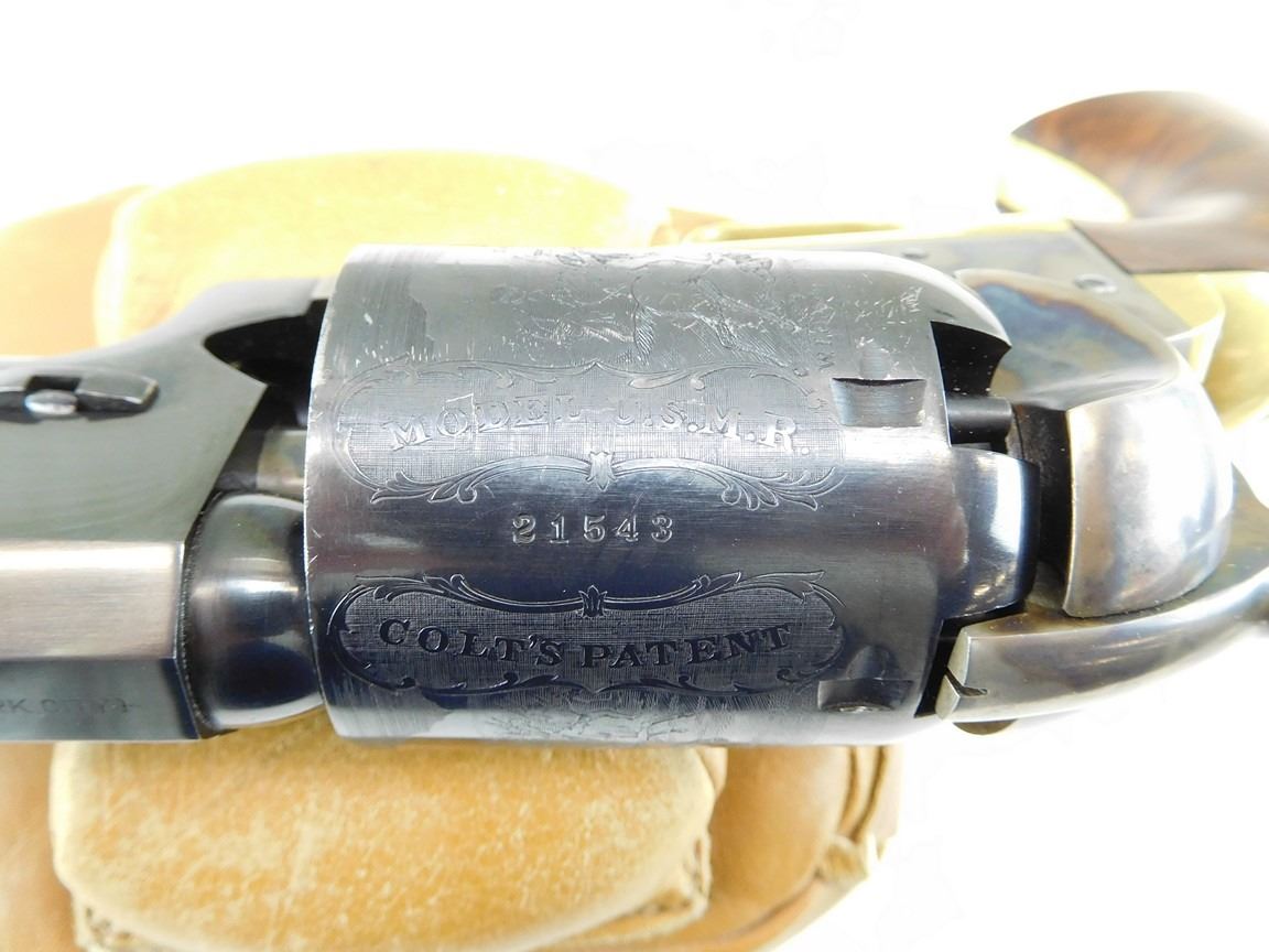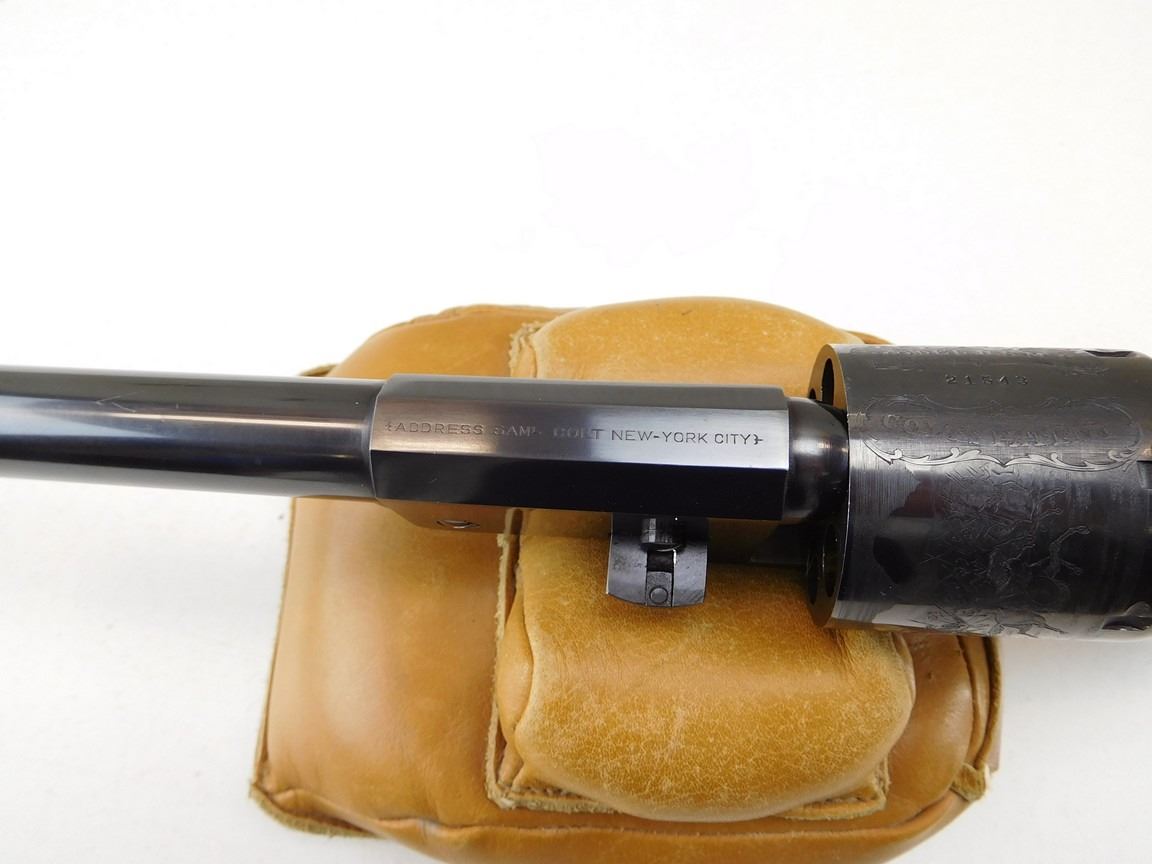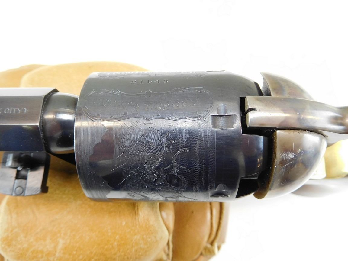 BARREL ADDRESS IS SAM L COLT NEW YORK CITY, ENGRAVED COWBOY SCENE ON THE RECEIVER, CASE CLOURED FRAME LOADING ROD AND HAMMER, BRASS GRIP STRAPS AND TRIGGER GUARD, HIGH GRADE WALNUT GRIPS, NOTCH AND BLADE SIGHTS , BARREL LENGTH: 190MM , SERIAL: 21543 , ACTION: REVOLVER , CONDITION: 9/10 , STOCK # R2377 , CLASS: CANADIAN RESTRICTED CLASS
