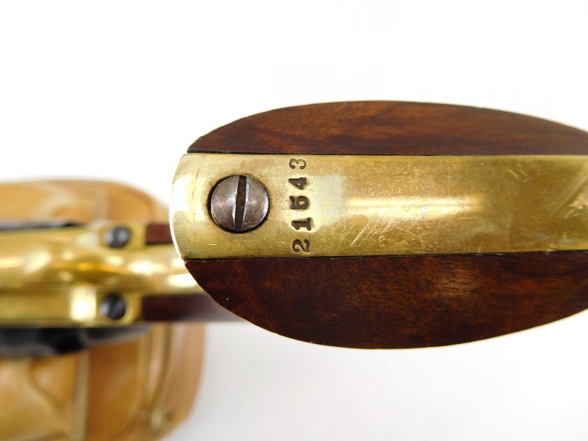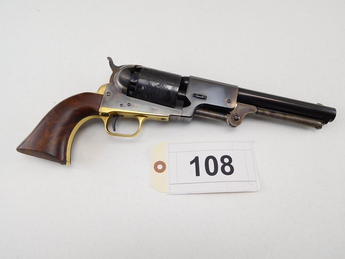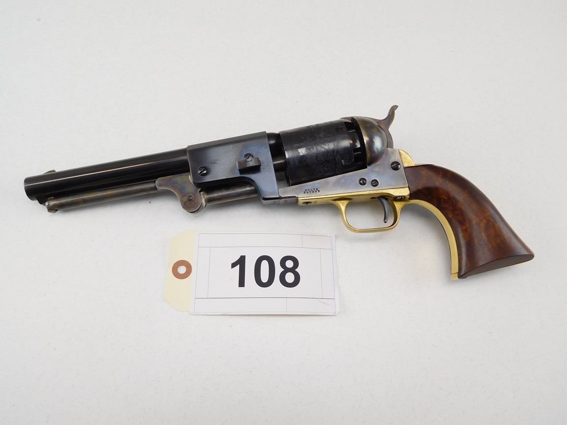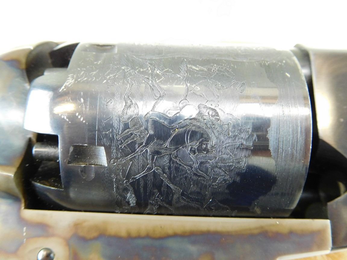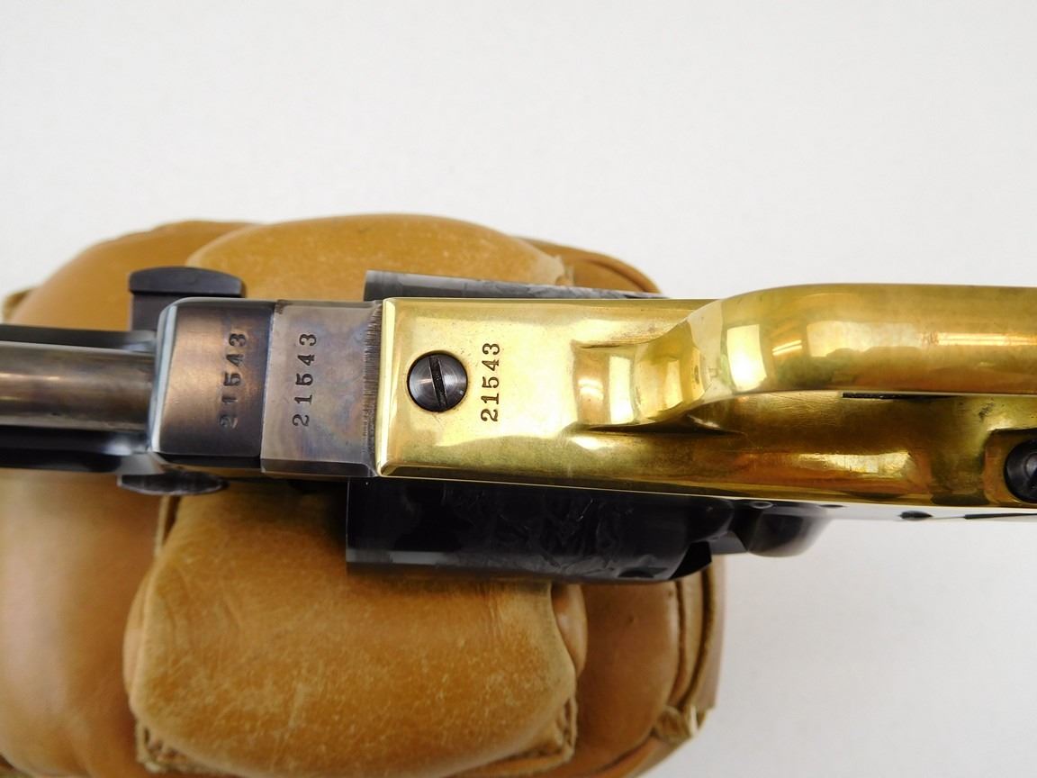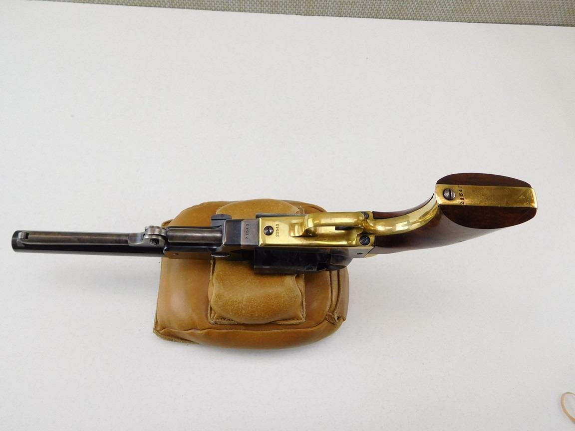 BARREL ADDRESS IS SAM L COLT NEW YORK CITY, ENGRAVED COWBOY SCENE ON THE RECEIVER, CASE CLOURED FRAME LOADING ROD AND HAMMER, BRASS GRIP STRAPS AND TRIGGER GUARD, HIGH GRADE WALNUT GRIPS, NOTCH AND BLADE SIGHTS , BARREL LENGTH: 190MM , SERIAL: 21543 , ACTION: REVOLVER , CONDITION: 9/10 , STOCK # R2377 , CLASS: CANADIAN RESTRICTED CLASS