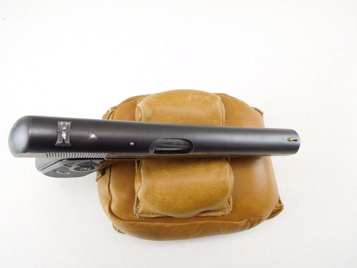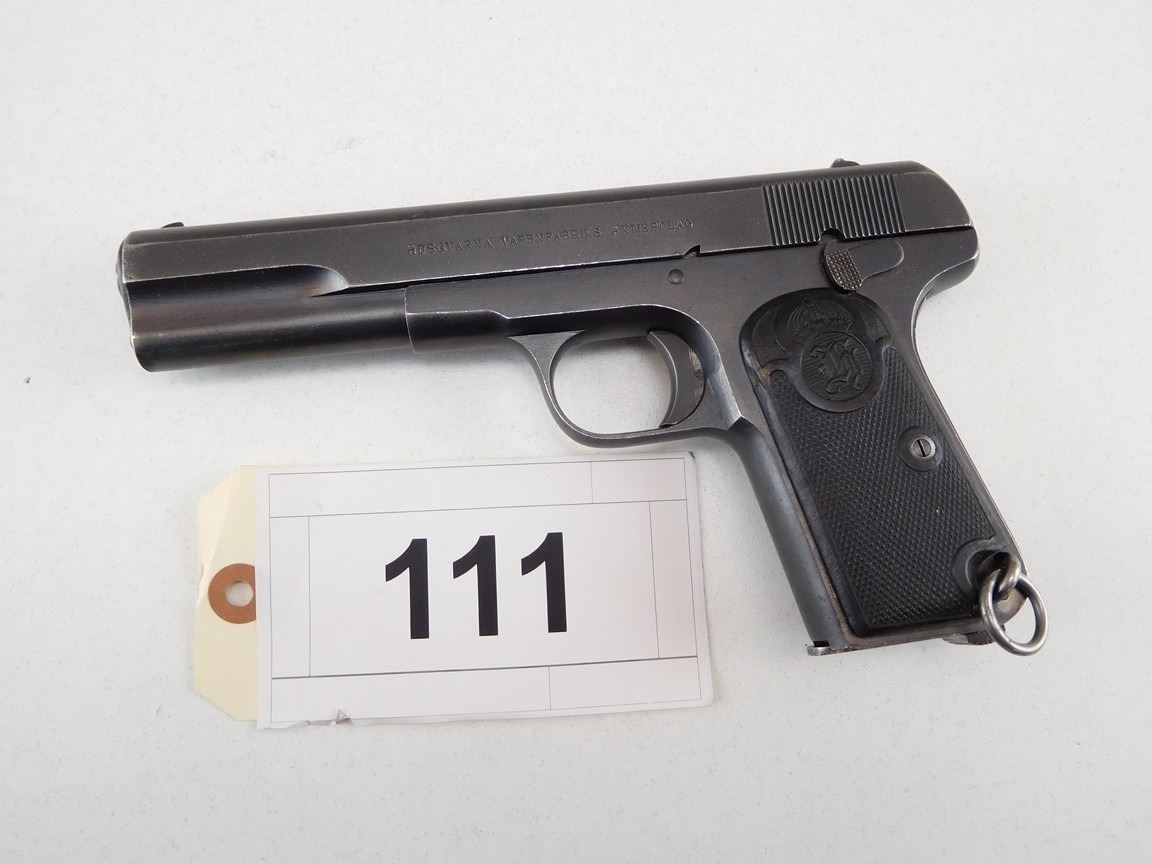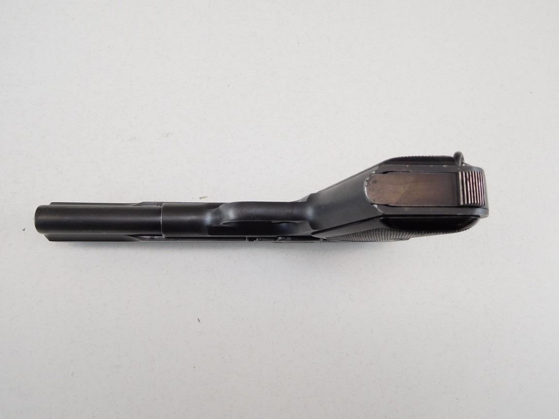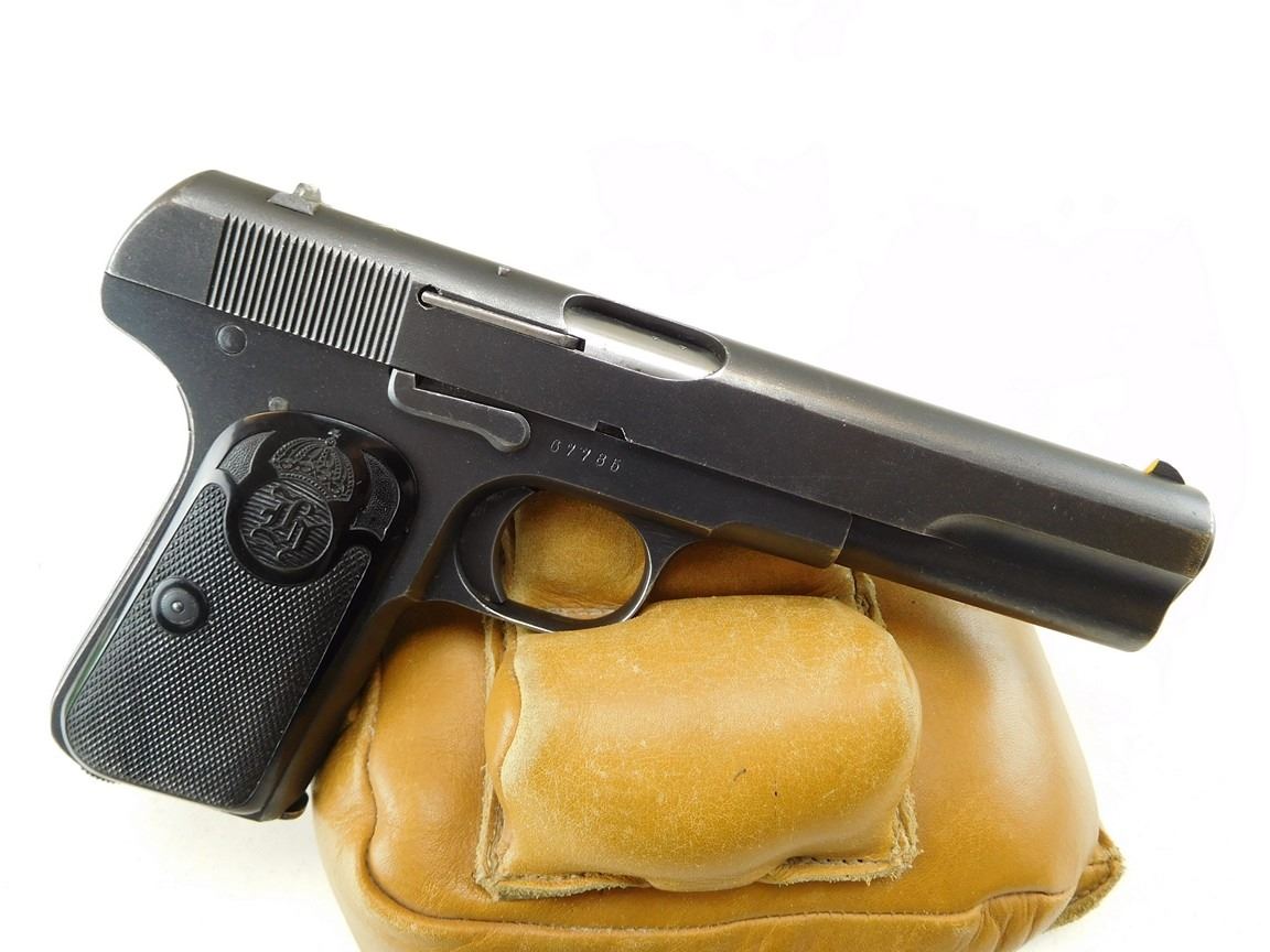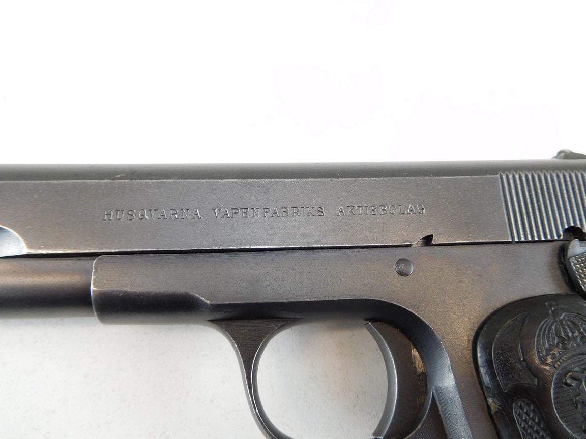 COMES WITH MAGAZINE, MANUFACTURED BY HUSQVARNA, HAS LANYARD LOOP, NOTCH AND BLADE SIGHT, EXCELLENT BORE, GRIP SAFETY , BARREL LENGTH: 127MM , SERIAL: 67785 , ACTION: SEMIAUTOMATIC HANDGUN , CONDITION: 9/10 , STOCK # R2380 , CLASS: CANADIAN RESTRICTED CLASS