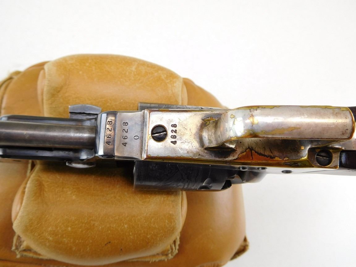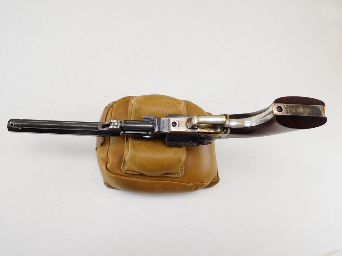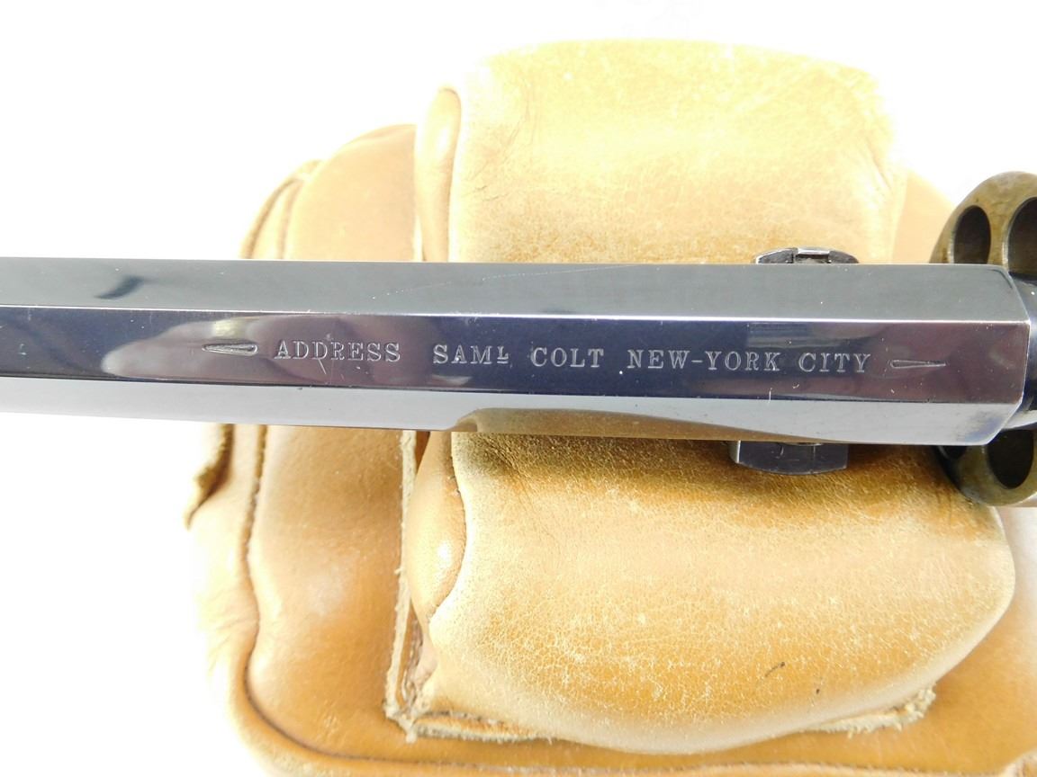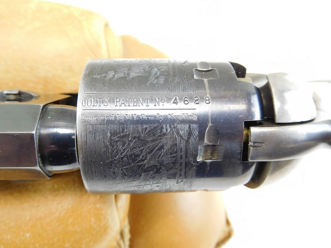EARLY SECOND GENERATION, MANUFACTURED IN 1971, BARREL ADDRESS SAM L COLT NEW YORK CITY, OCTAGONAL BARREL, NOTCH AND BEAD SIGHT, CASE COLORED FRAME HAMMER NICKEL PLATED BRASS STRAPS, ENGRAVED NAVEL BATTLE SCENE ON THE CYLINDER , BARREL LENGTH: 191MM , SERIAL: 4628 , ACTION: REVOLVER , CONDITION: 8/10 , STOCK # R2385 , CLASS: CANADIAN RESTRICTED CLASS
