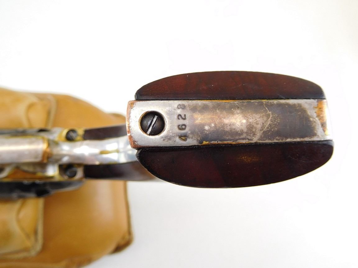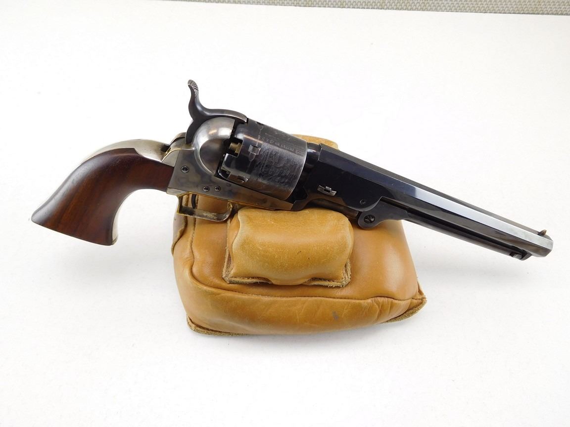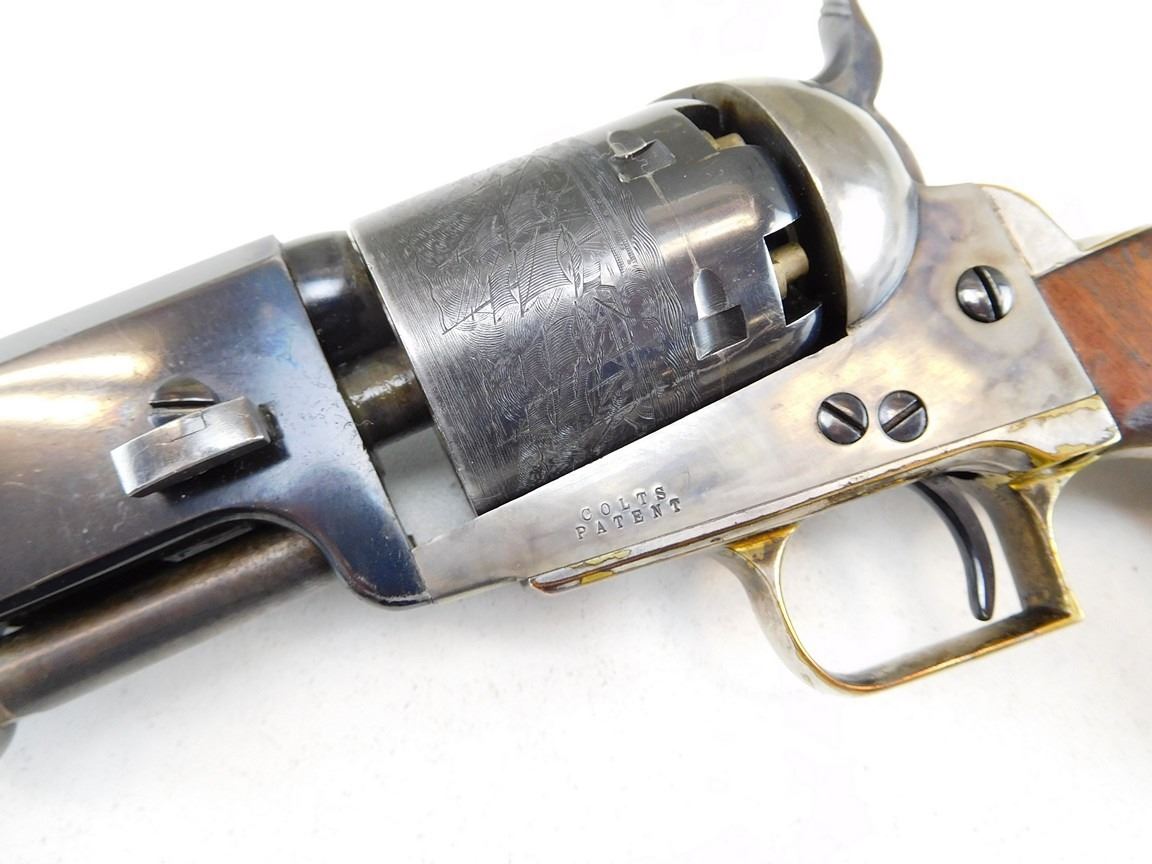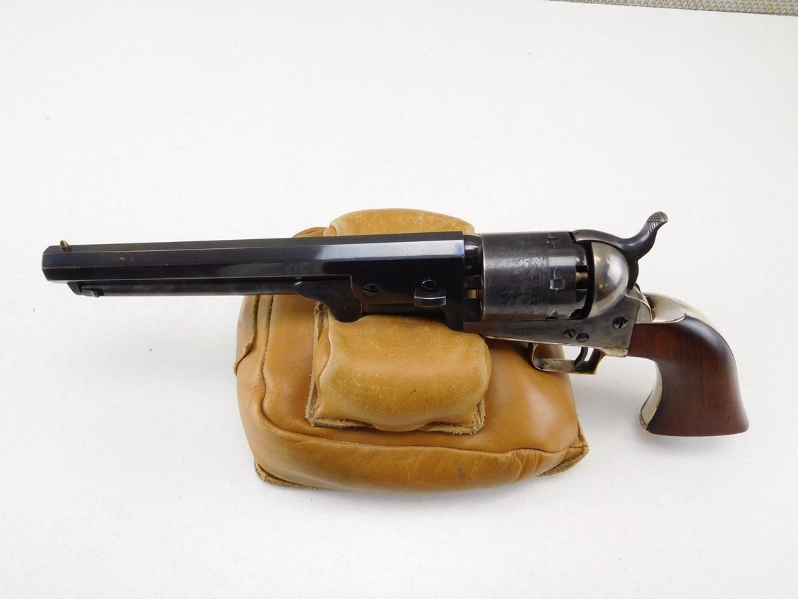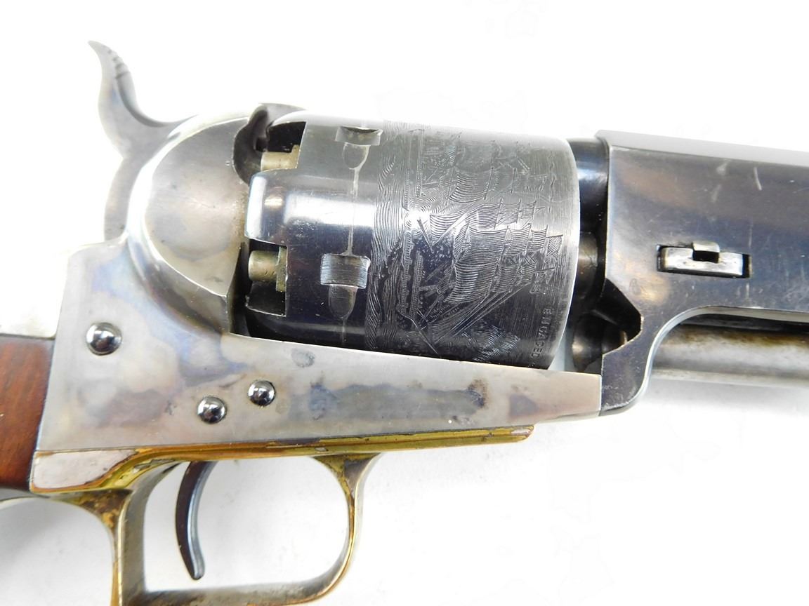 EARLY SECOND GENERATION, MANUFACTURED IN 1971, BARREL ADDRESS SAM L COLT NEW YORK CITY, OCTAGONAL BARREL, NOTCH AND BEAD SIGHT, CASE COLORED FRAME HAMMER NICKEL PLATED BRASS STRAPS, ENGRAVED NAVEL BATTLE SCENE ON THE CYLINDER , BARREL LENGTH: 191MM , SERIAL: 4628 , ACTION: REVOLVER , CONDITION: 8/10 , STOCK # R2385 , CLASS: CANADIAN RESTRICTED CLASS