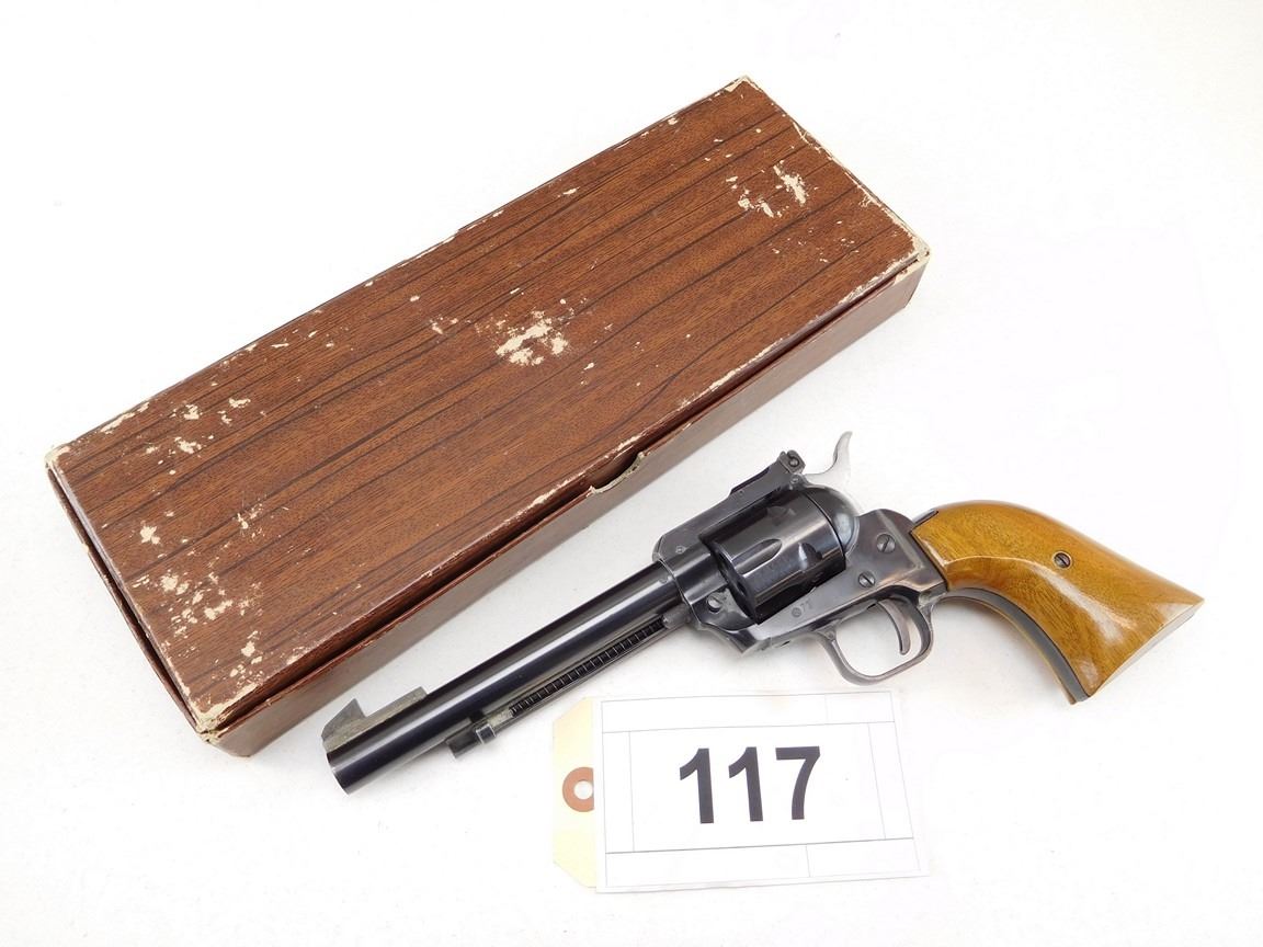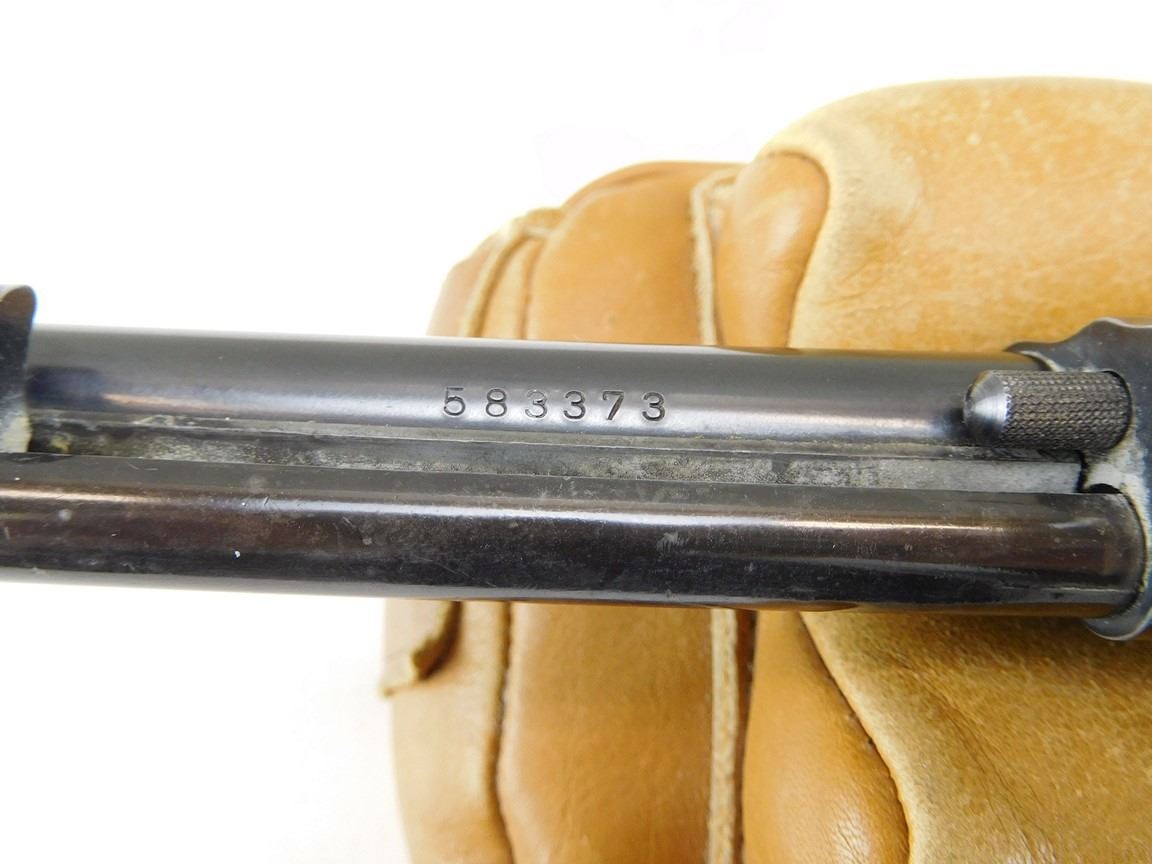 COMES WITH BOX, ADJUSTABLE TARGET SIGHTS, WOODEN GRIPS, SINGLE ACTION , BARREL LENGTH: 140MM , SERIAL: 583373 , ACTION: REVOLVER , CONDITION: 7/10 , STOCK # R2386 , CLASS: CANADIAN RESTRICTED CLASS