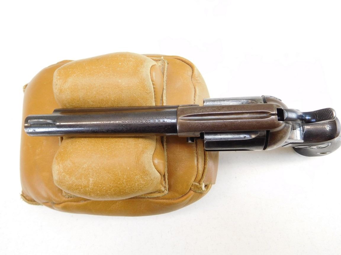 MANUFACTURED IN 1904, BIRDS HEAD GRIP, DOUBLE ACTION, HARD RUBBER CHECKERED GRIPS, CASE COLOURED RECEIVER, SHOWING HOLSTER WEAR ON THE BARREL, LOCK UP AND INDEXING ARE GOOD, HAS AN EXCELLENT BORE, NOTCH AND BEAD SIGHT , BARREL LENGTH: 114MM , SERIAL: 150513 , ACTION: REVOLVER , CONDITION: 8/10 , STOCK # R2406 , CLASS: CANADIAN RESTRICTED CLASS