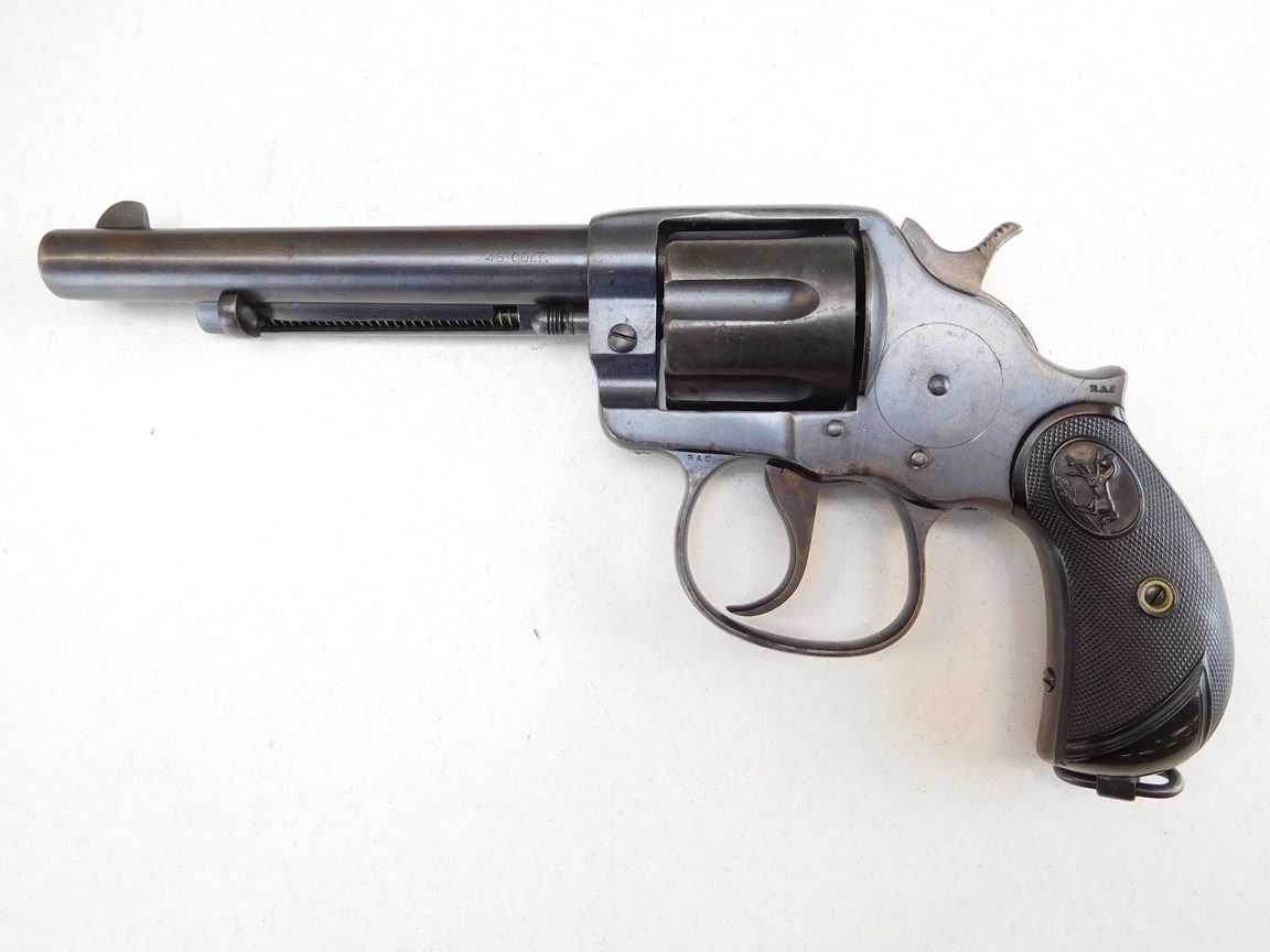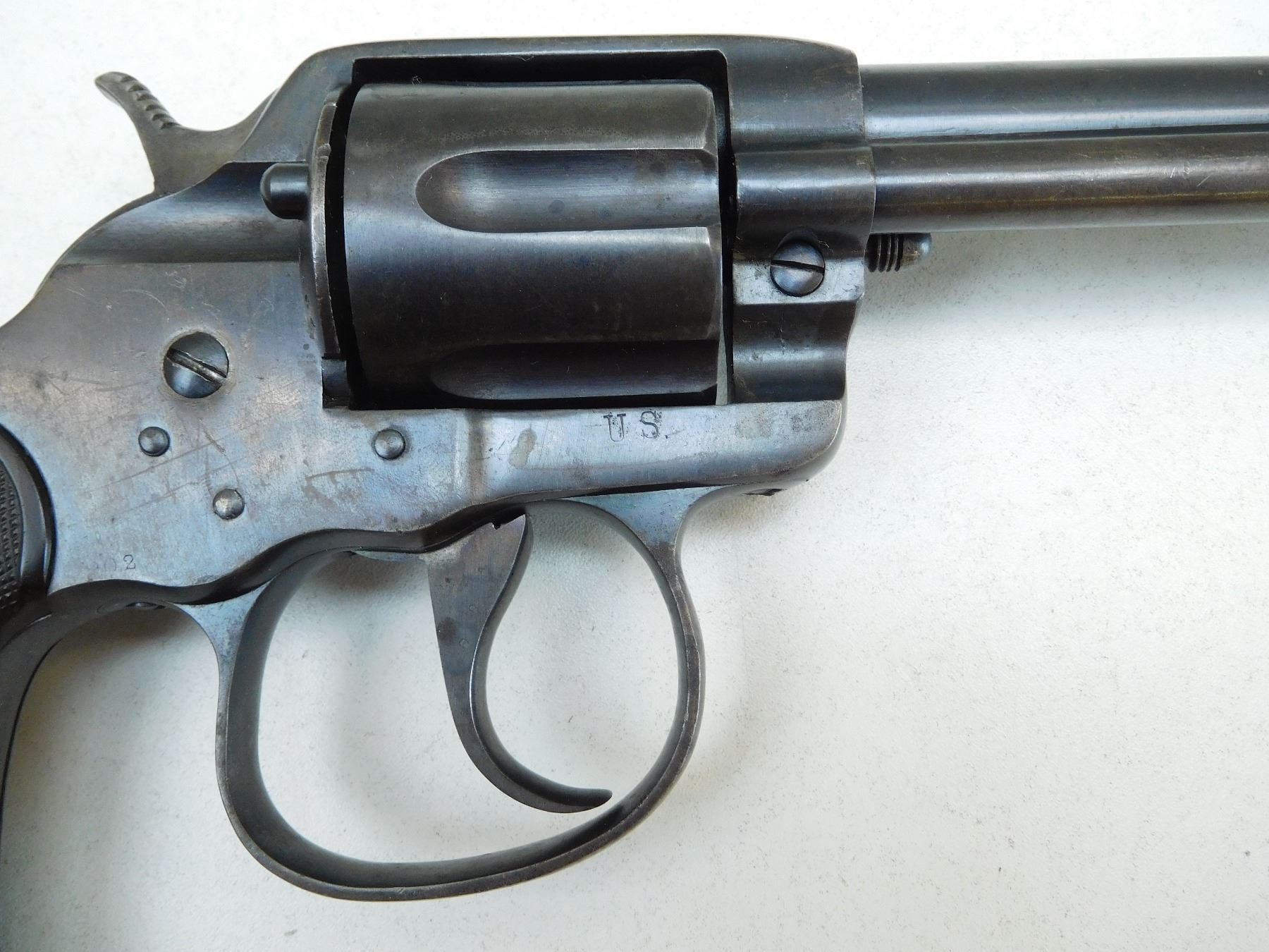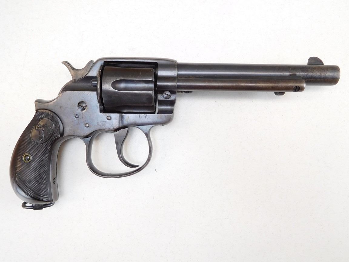 STAMPED US ON THE FRAME JUST ABOVE THE TRIGGER GUARD, HARD RUBBER BIRDS HEAD CHECKERED GRIP, LANYARD LOOP, NOTCH AND BLADE SIGHT, HARTFORD CONNETTICUT BARREL ADDRESS,SERIAL NUMBER DATES THIS 1900, THE RAC INSPECTOR MARK IS ON THE FRAME AND TRIGGER GUARD, (RAC) STANDS FOR RENALDO A CARR HE WAS A CIVILIAN WAR DEPARTMENT SUB INSPECTOR OF COLT REVOLVERS 1889-1909, DOUBLE ACTION, INDEXES AND LOCKS UP WELL, SOME HOLSTER WEAR ON THE MUZZLE OF THE BARREL, BORE IS EXCELLENT , BARREL LENGTH: 152MM , SERIAL: 44164 , ACTION: REVOLVER , CONDITION: 8/10 , STOCK # R2410 , CLASS: CANADIAN RESTRICTED CLASS