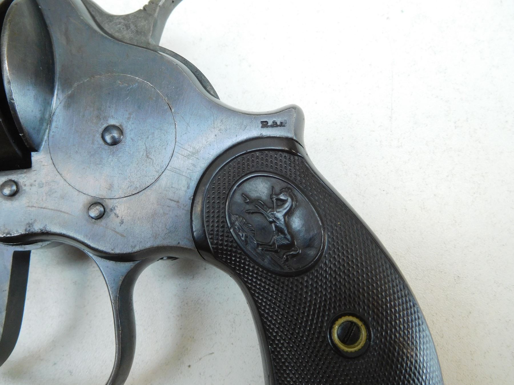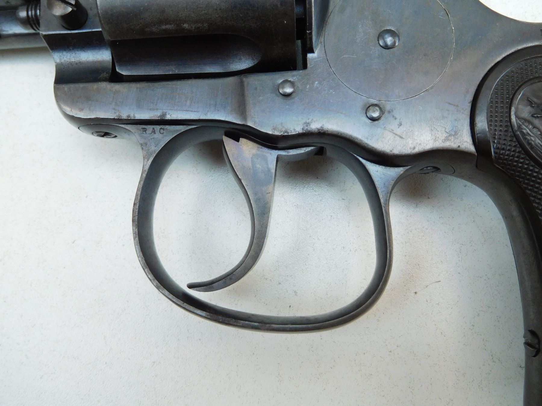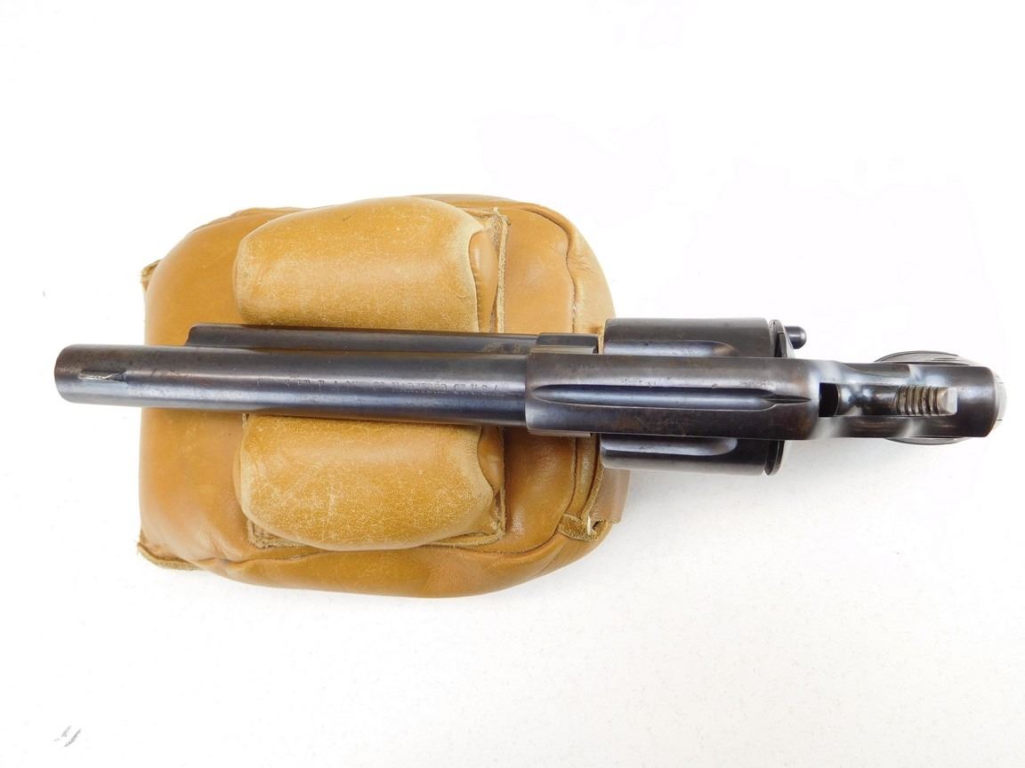 STAMPED US ON THE FRAME JUST ABOVE THE TRIGGER GUARD, HARD RUBBER BIRDS HEAD CHECKERED GRIP, LANYARD LOOP, NOTCH AND BLADE SIGHT, HARTFORD CONNETTICUT BARREL ADDRESS,SERIAL NUMBER DATES THIS 1900, THE RAC INSPECTOR MARK IS ON THE FRAME AND TRIGGER GUARD, (RAC) STANDS FOR RENALDO A CARR HE WAS A CIVILIAN WAR DEPARTMENT SUB INSPECTOR OF COLT REVOLVERS 1889-1909, DOUBLE ACTION, INDEXES AND LOCKS UP WELL, SOME HOLSTER WEAR ON THE MUZZLE OF THE BARREL, BORE IS EXCELLENT , BARREL LENGTH: 152MM , SERIAL: 44164 , ACTION: REVOLVER , CONDITION: 8/10 , STOCK # R2410 , CLASS: CANADIAN RESTRICTED CLASS