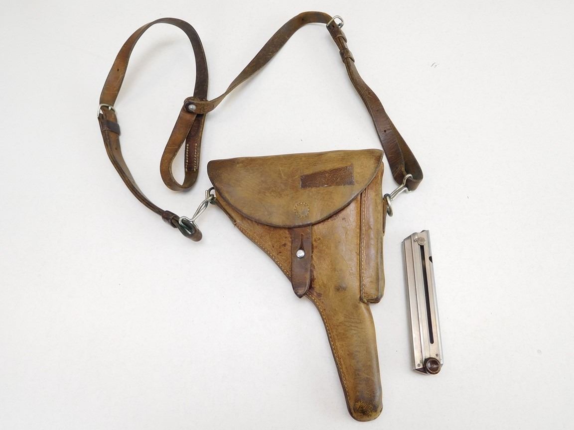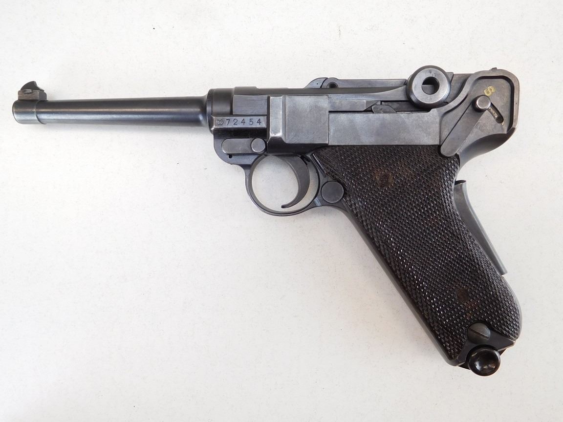 COMES WITH LEATHER HOLSTER AND 2 MAGAZINES, EXCELLENT BORE, MATCHING NUMBERS, NOTCH AND BLADE SIGHT, CHECKERED WOODEN GRIPS, GRIP SAFETY, 95% ORIGINAL BLUEING REMAINING , BARREL LENGTH: 120MM , SERIAL: 72454 , ACTION: SEMIAUTOMATIC HANDGUN , CONDITION: 9/10 , STOCK # R2442 , CLASS: CANADIAN RESTRICTED CLASS