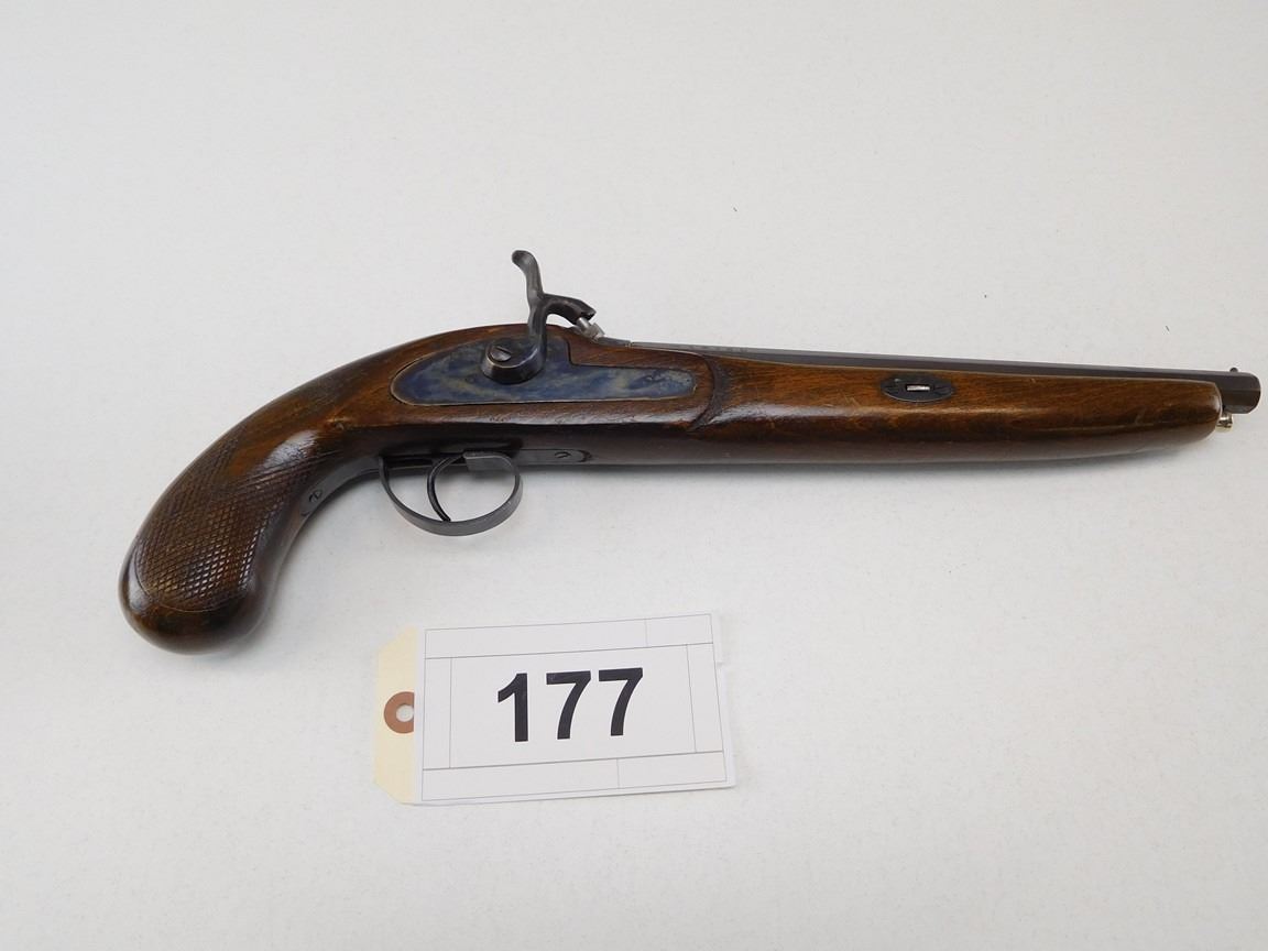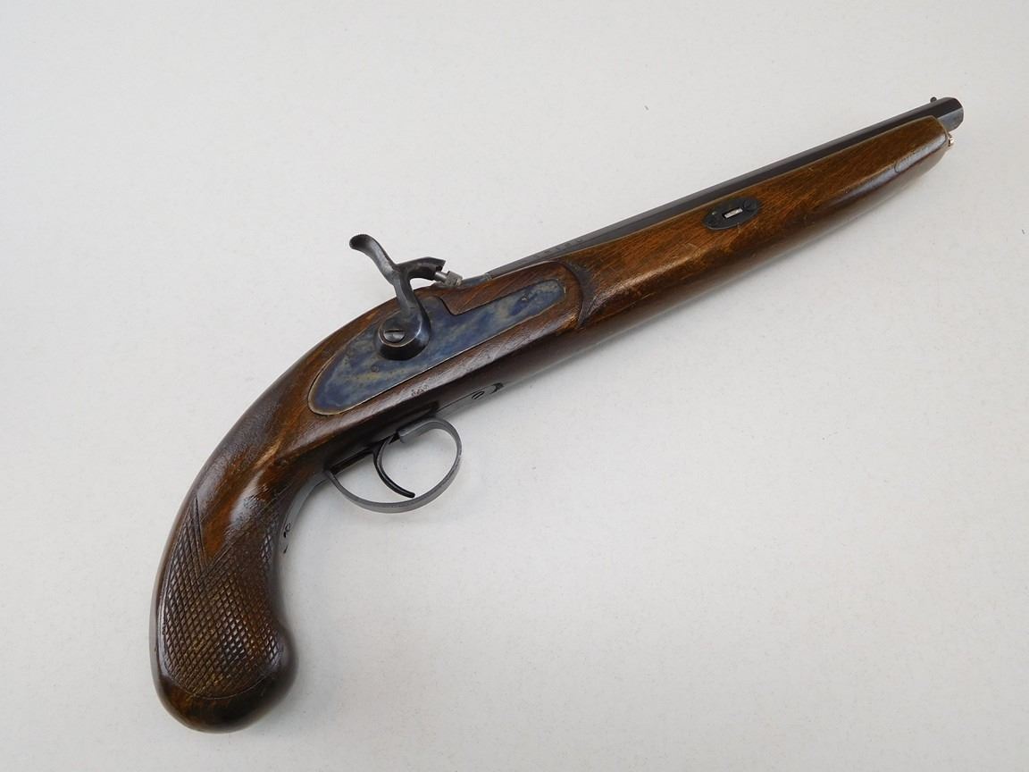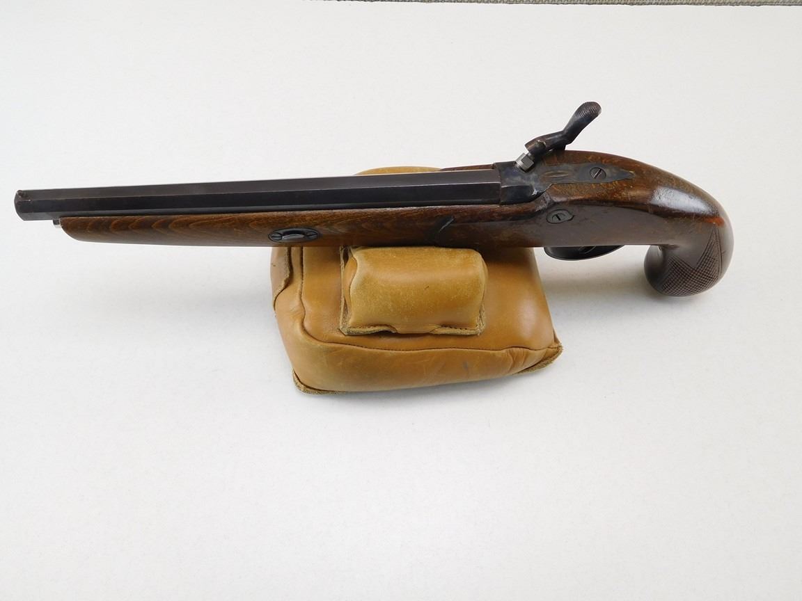 CHECKERED WOODEN STOCK, CASE COLOURED BLOCK, OCTAGONAL BARREL, BEAD FRONT SIGHT , BARREL LENGTH: 246MM , SERIAL: 13680 , ACTION: PERCUSSION , CONDITION: 7/10 , STOCK # R2446 , CLASS: CANADIAN RESTRICTED CLASS