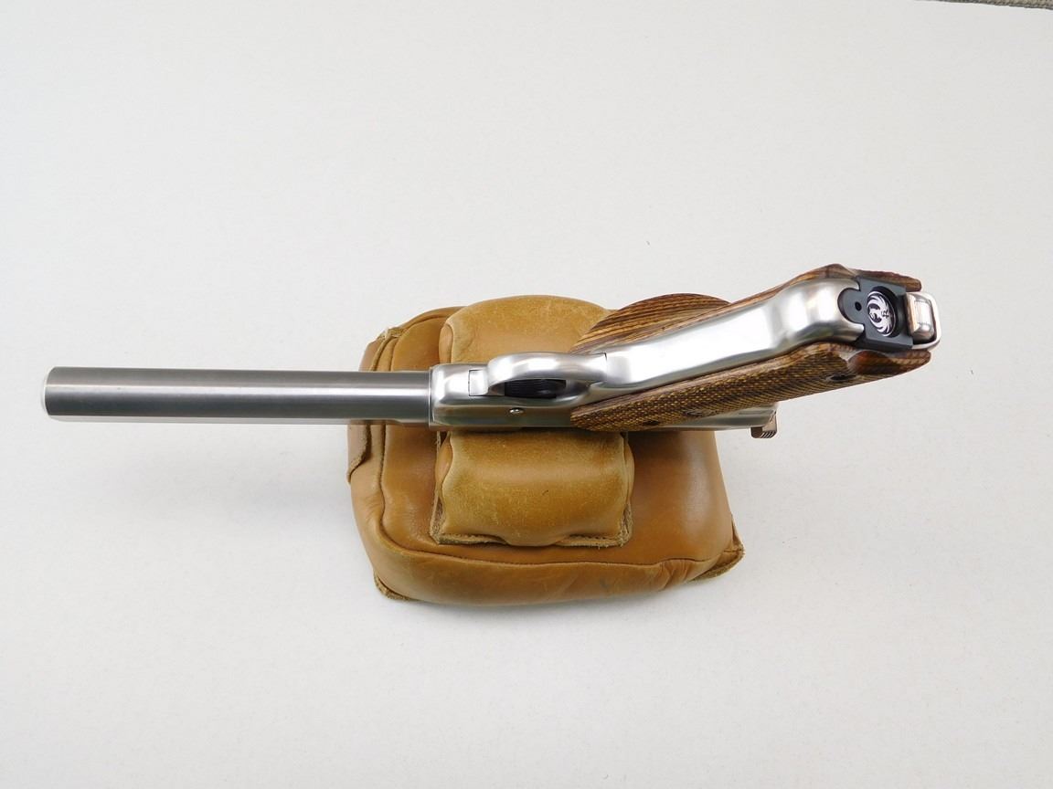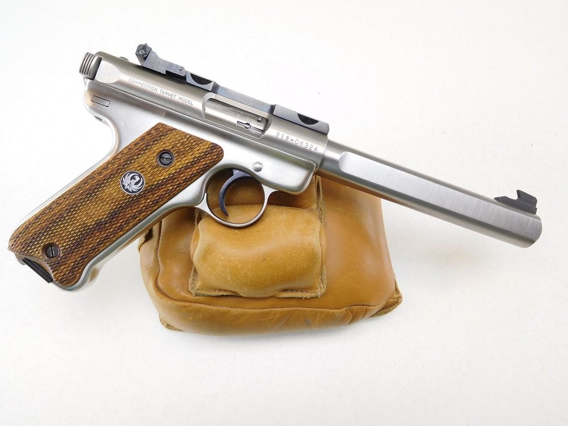 COMES WITH CASE AND 2 MAGAZINES, LAMINATED CHECKERED WOODEN GRIPS, STAINLESS FINISH, BULL BARREL, ADJUSTABLE TARGET SIGHTS , BARREL LENGTH: 133MM , SERIAL: 21806324 , ACTION: SEMIAUTOMATIC HANDGUN , CONDITION: 9/10 , STOCK # R2454 , CLASS: CANADIAN RESTRICTED CLASS