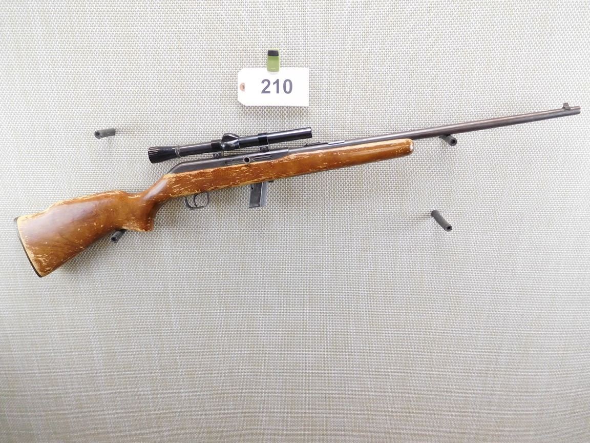 COMES WITH MAGAZINE, WEAVER MARKSMAN 4X SCOPE, RAISED FRONT AND ADJUSTABLE REAR SIGHTS, HARD RUBBER BUTT PLATE, SOME VARNISH FLAKING OFF STOCK , BORE IS GOOD , BARREL LENGTH: 20" , SERIAL: CA111621 , ACTION: SEMI AUTOMATIC RIFE , CONDITION: 7/10 , STOCK # 6675 , CLASS: CANADIAN NON RESTRICTED CLASS
