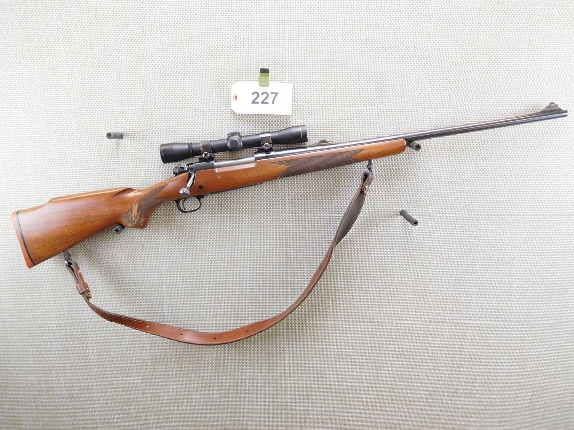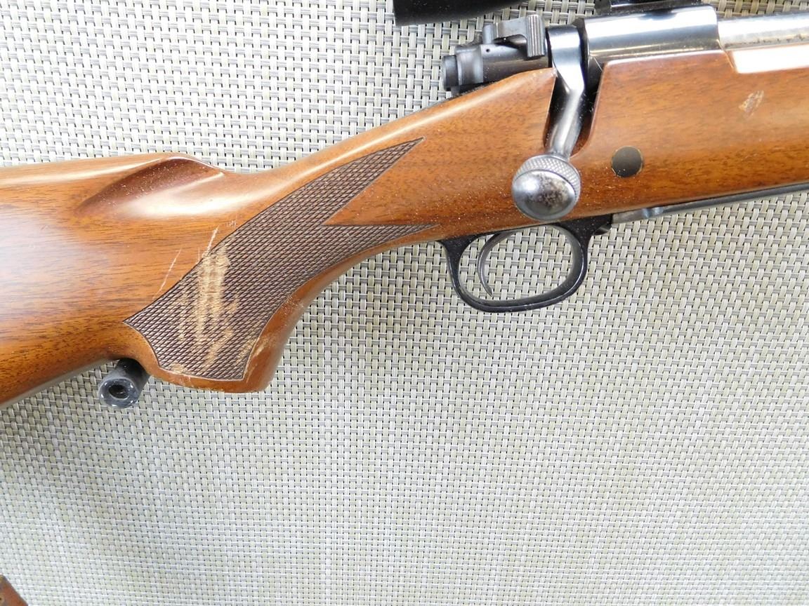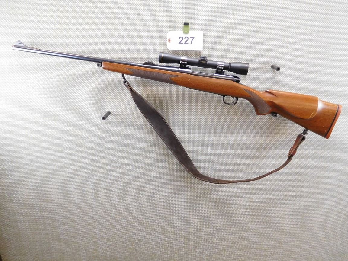 LEUPOLD SCOPE M8 4X POWER SCOPE, FLIP ADJUSTABLE REAR AND FRONT SIGHT, EXCELLENT BORE, MONTE CARLO STOCK WITH A CHECKERED FOREEND AND SEMI PISTOL GRIP, HINGED FLOOR PLATE, DETACHEABLE SLING SWIVELS WITH LEATHER SLING, HARD RUBBER BUTT PLATE , THERE IS A SMALL CHIP ON THE PISTOL GRIP , BARREL LENGTH: 24" , SERIAL: G1826074 , ACTION: BOLT ACTION RIFLE , CONDITION: 7/10 , STOCK # 6692 , CLASS: CANADIAN NON RESTRICTED CLASS