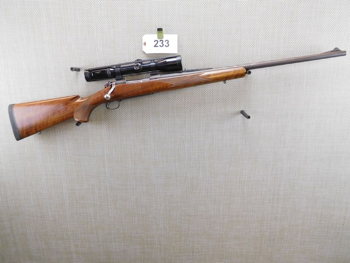 HINGED FLOOR PLATE, SWAROVSKI 1.5- 6 NOVA MODEL POWER SCOPE, EXPRESS REAR AND RAISED FRONT SIGHT, SLING SWIVEL STUDS, RAISED CHEEK PIECE, CHECKERED FOREND AND FULL PISTOL GRIP, RUBBER BUTT PAD, BORE IS EXCELLENT,THIS RIFLE WAS COMPLETELY RECONDITIONED AND REBLUED, BARREL LENGTH: 24" , SERIAL: 40174 , ACTION: BOLT ACTION RIFLE , CONDITION: 8/10 , STOCK # 6698 , CLASS: CANADIAN NON RESTRICTED CLASS