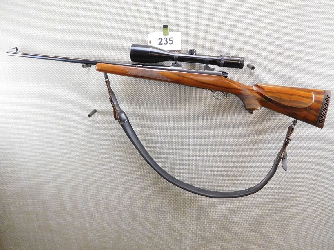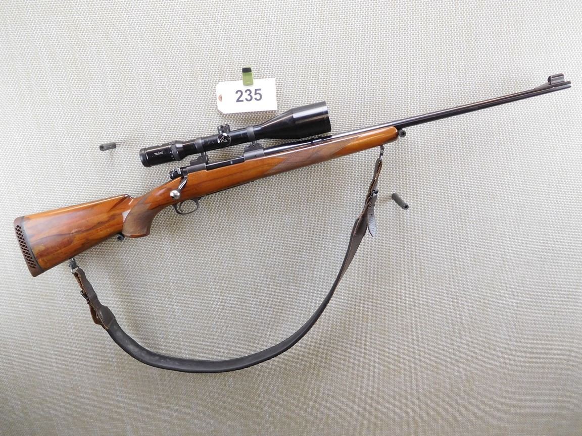 SWAROVSKI 3 - 12 NOVA SCOPE, HINGED FLOOR PLATE, HOODED FRONT SIGHT, NO REAR SIGHT, CHECKERED FULL END AND FULL PISTOL GRIP BUTT STOCK, VENTED RUBBER RECOILD PAD, DETACHABLE SLING SWIVELS WITH LEATHER SLING, BORE IS EXCELLENT, RAISED CHEEK PIECE, AMERICAN WALNUT , BARREL LENGTH: 24" , SERIAL: 450617 , ACTION: BOLT ACTION RIFLE , CONDITION: 8/10 , STOCK # 6700 , CLASS: CANADIAN NON RESTRICTED CLASS