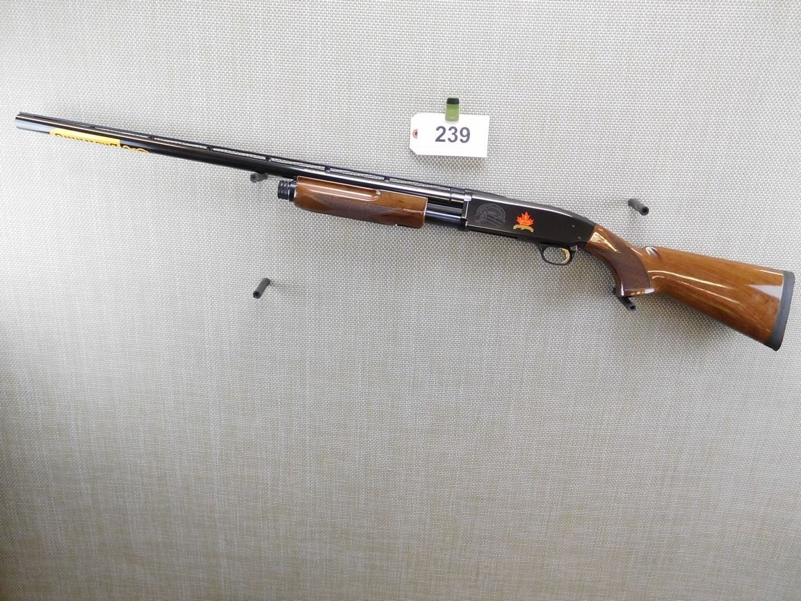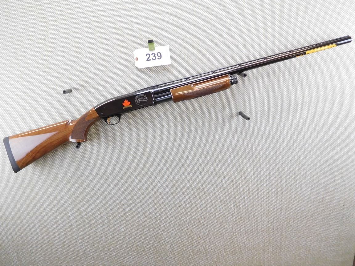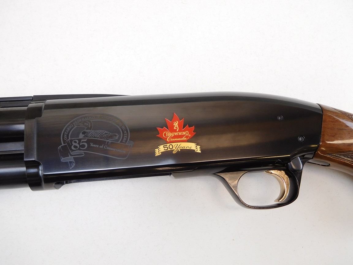 ONTARIO FEDERATION OF ANGLERS AND HUTNERS 85 YEARS OF CONSERVATION, RAISED VENTED RIB WITH FRONT BEAD SIGHT, CHECKERED FOREEND AND PISTOL GRIP FORESTOCK, RUBBER RECOIL PAD, EXCELLENT BORE, FIXED IMPROVED CYLINDER CHOKE , BARREL LENGTH: 26" , SERIAL: 08930MP121 , ACTION: PUMP ACTION SHOTGUN , CONDITION: 9/10 , STOCK # 6704 , CLASS: CANADIAN NON RESTRICTED CLASS
