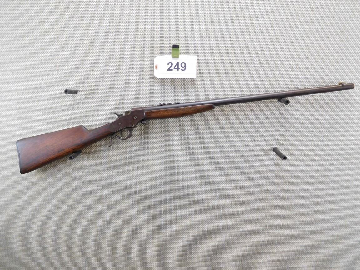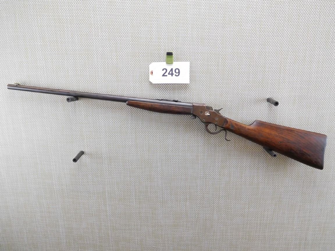 DARK BORE, BLADE FRONT AND ADJUSTABLE REAR SIGHT, OCTAGONAL RECEIVER, HARD RUBBER BUTT PLATE , BARREL LENGTH: 24" , SERIAL: 3948 , ACTION: SINGLE SHOT FALLING BLOCK , CONDITION: 6/10 , STOCK # 6714 , CLASS: CANADIAN NON RESTRICTED CLASS
