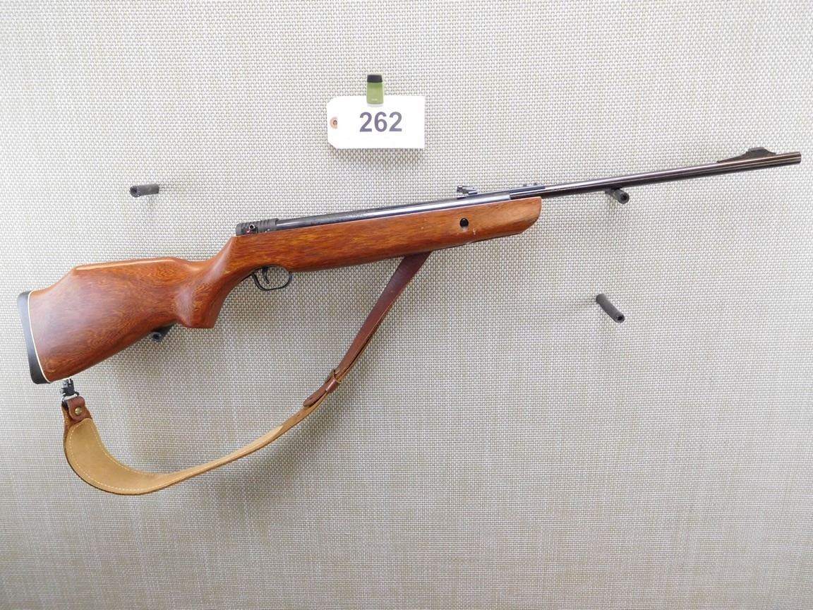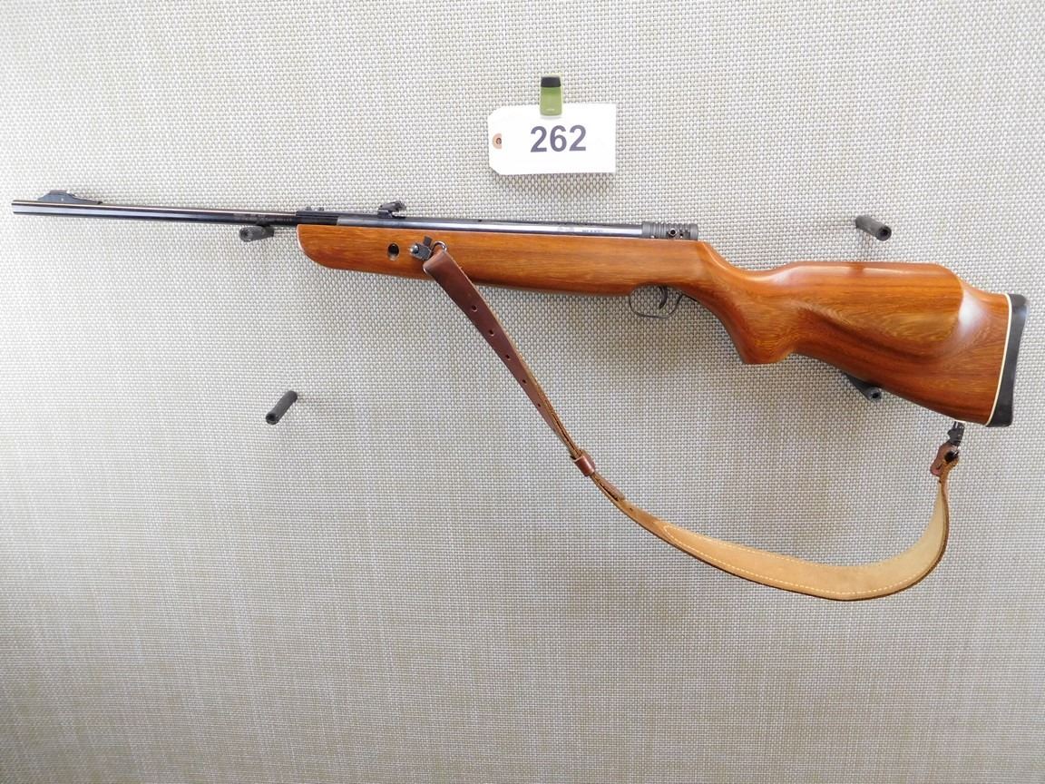 IMPORTED BY CROSMAN, WHITE DOT FRONT AND REAR SIGHT, MONTE CARLO STOCK WITH RAISED CHEEK PIECE, RECOIL PAD, DETACHABLE SLING SWIVELS WITH LEATHER SLING , BARREL LENGTH: 16" , SERIAL: 03055057C , ACTION: AIR RIFLE , CONDITION: 8/10 , STOCK # 6727 , CLASS: CANADIAN NON RESTRICTED CLASS