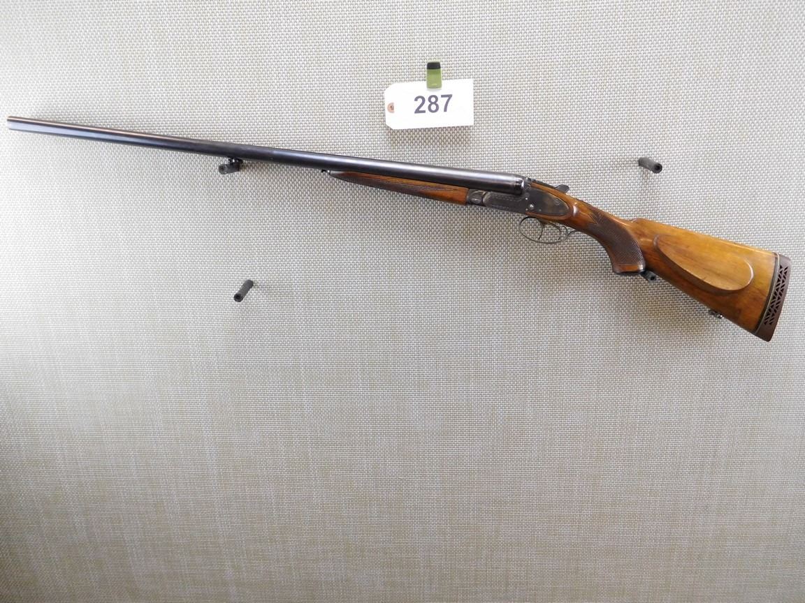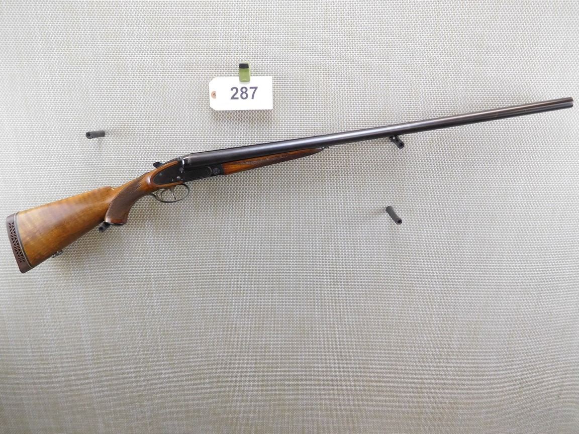 SIDE LOCK, THERE IS A BULGE IN THE LEFT BARREL AT APPROX 13" FROM THE BREACH, ( THIS COULD BE REPAIRED), CHOKES ARE FIXED FULL, CHECKERED FOREND AND CAPPED PISTOL GRIP WITH VENTED RECOIL PAD, SLING SWIVELS, BEAD FRONT SIGHT WITH A SOLID RIB, BORE IS VERY GOOD , BARREL LENGTH: 28" , SERIAL: 2357258 , ACTION: SIDE BY SIDE BREAK ACTION SHOTGUN , CONDITION: 6/10 , STOCK # 6752 , CLASS: CANADIAN NON RESTRICTED CLASS