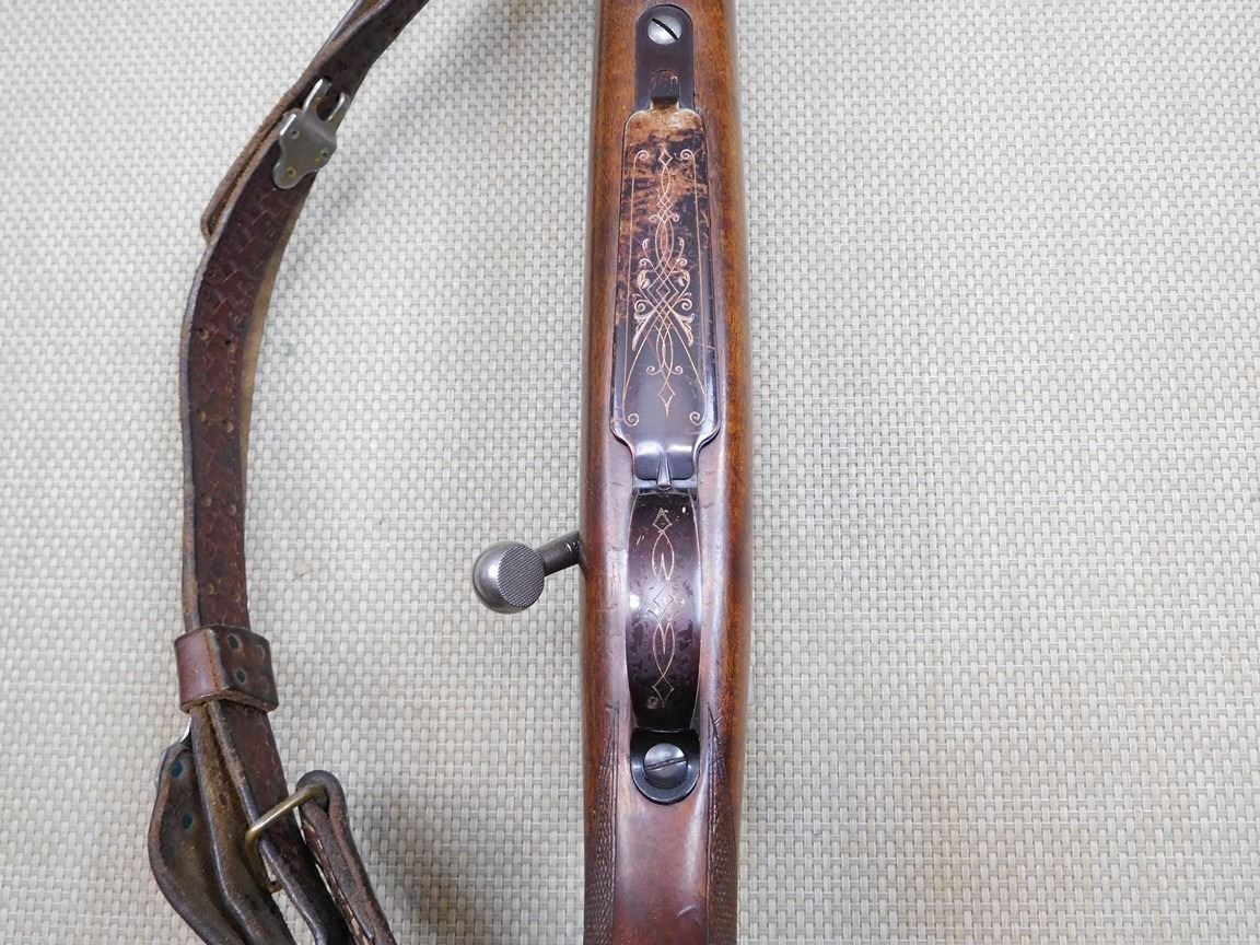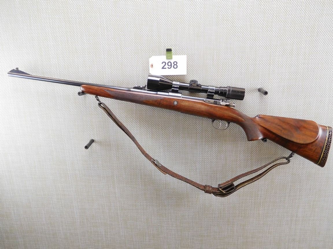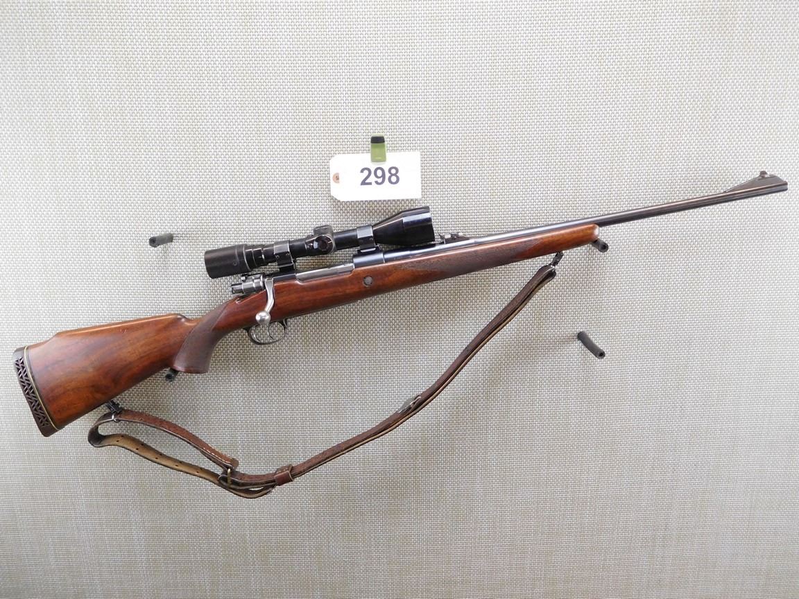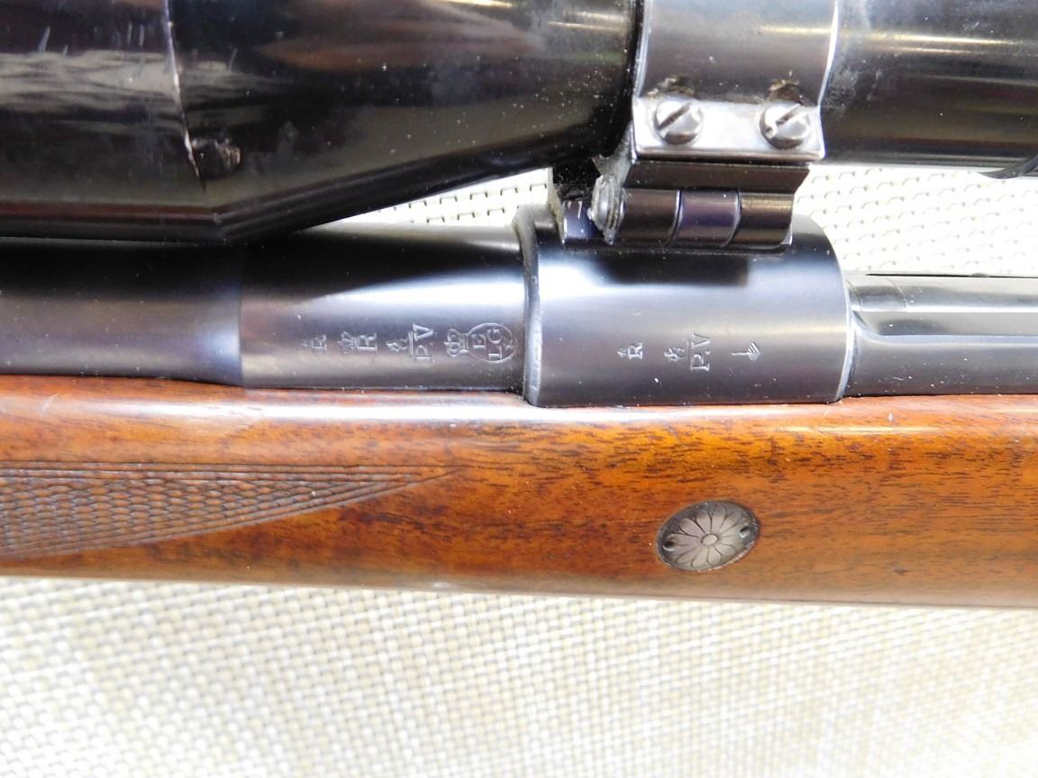 RAMP FRONT AND ADJUSTABLE REAR SIGHTS, MOUNTED WITH A WEAVER 3 - 9 POWER SCOPE, CHECKERED FOREND AND SEMI PISTOL GRIP BUTT STOCK WITH VENTED RUBBER RECOIL PAD, VERY GOOD BORE, SET TRIGGER, SLING SWIVELS WITH LEATHER SLING , BARREL LENGTH: 23" , SERIAL: L129 , ACTION: BOLT ACTION RIFLE , CONDITION: 8/10 , STOCK # 6763 , CLASS: CANADIAN NON RESTRICTED CLASS