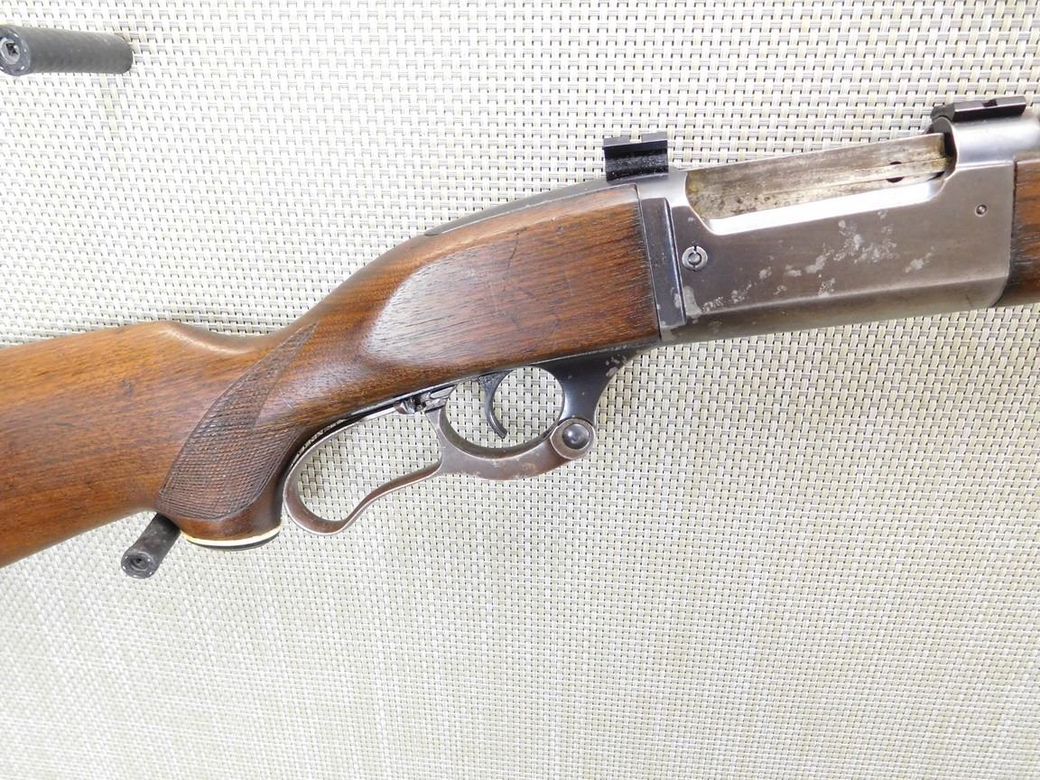 RAMP POST FRONT SIGHT AND ADJUSTABLE REAR SIGHT, DRILLED AND TAPPED WITH SCOPE MOUNTS, SLIGHT CRACK BEHIND THE REAR TANG, CAPPED PISTOL GRIP AND STEEL BUTT PLATE, CHECKERED STOCK, SLING STUDS, BORE IS FAIR , BARREL LENGTH: 24" , SERIAL: 645426 , ACTION: LEVER ACTION RIFLE , CONDITION: 6/10 , STOCK # 6869 , CLASS: CANADIAN NON RESTRICTED CLASS