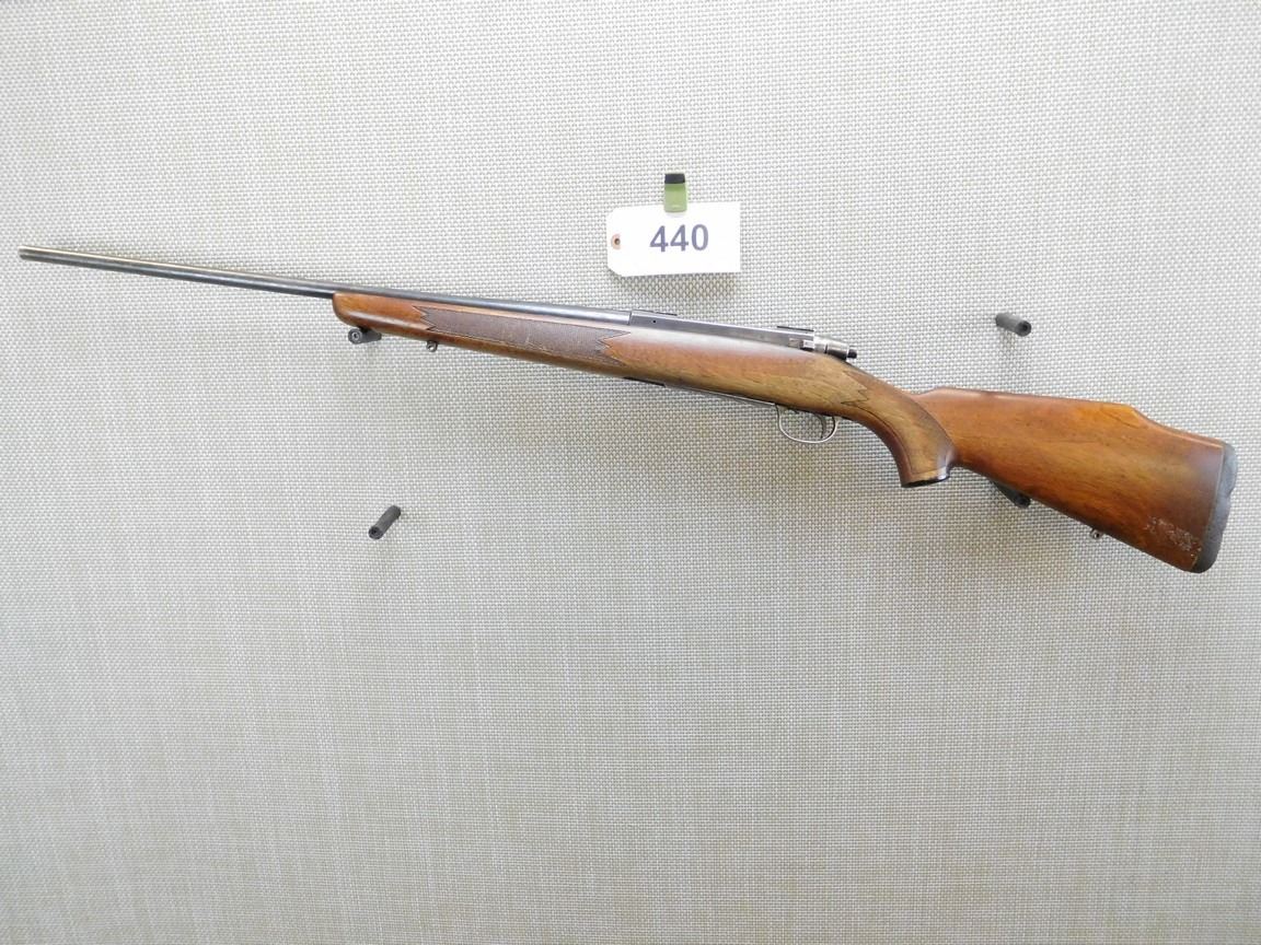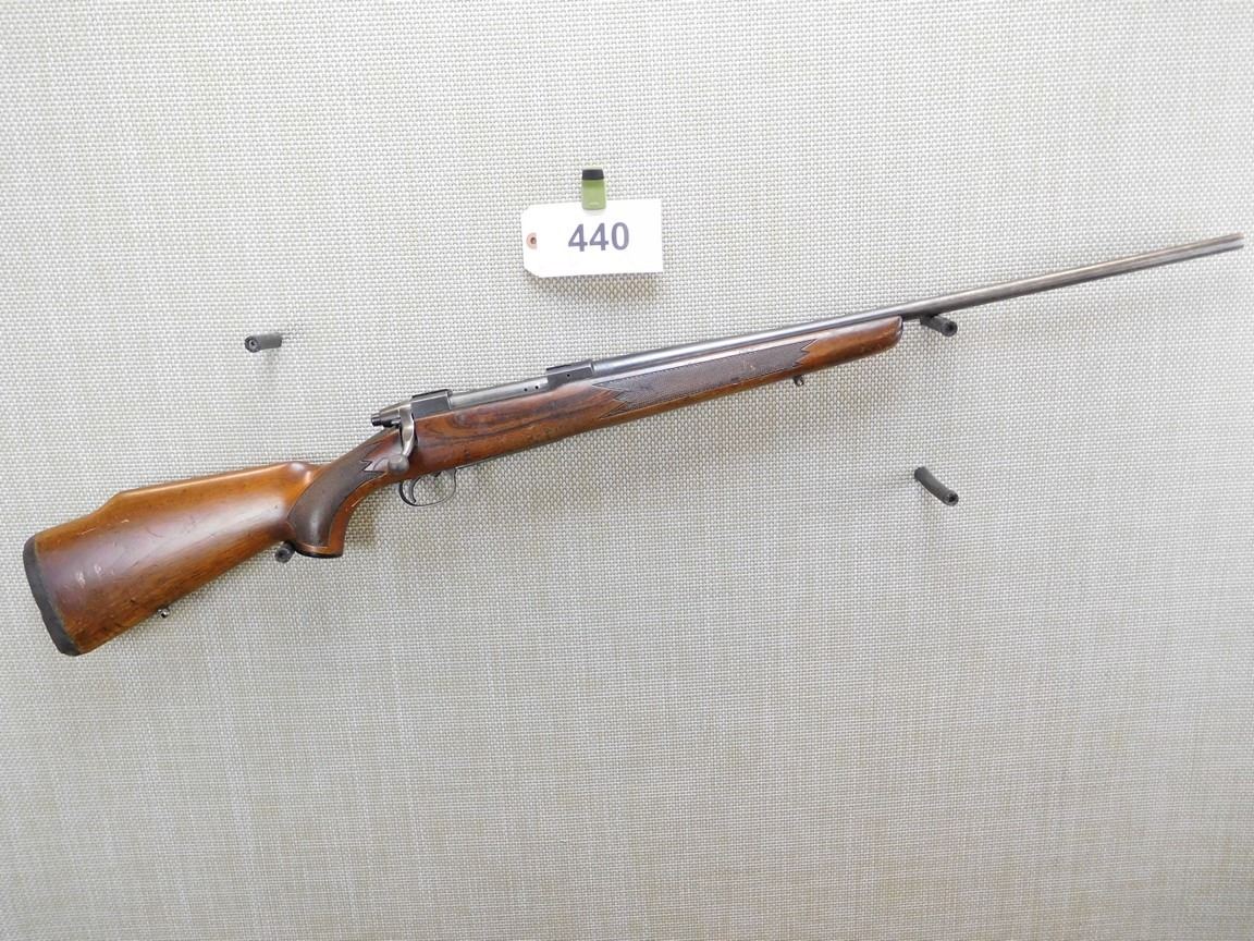 COMES WITH MAGAZINE, SLING STUDS, NO SIGHTS, DRILLED AND TAPPED FOR SCOPE MOUNTS, VERY GOOD BORE, CHECKERED FOREND AND FULL CAPPED PISTOL GRIP, RUBBER RECOIL PAD , BARREL LENGTH: 24" , SERIAL: 650-51570 , ACTION: BOLT ACTION RIFLE , CONDITION: 6/10 , STOCK # 6906 , CLASS: CANADIAN NON RESTRICTED CLASS