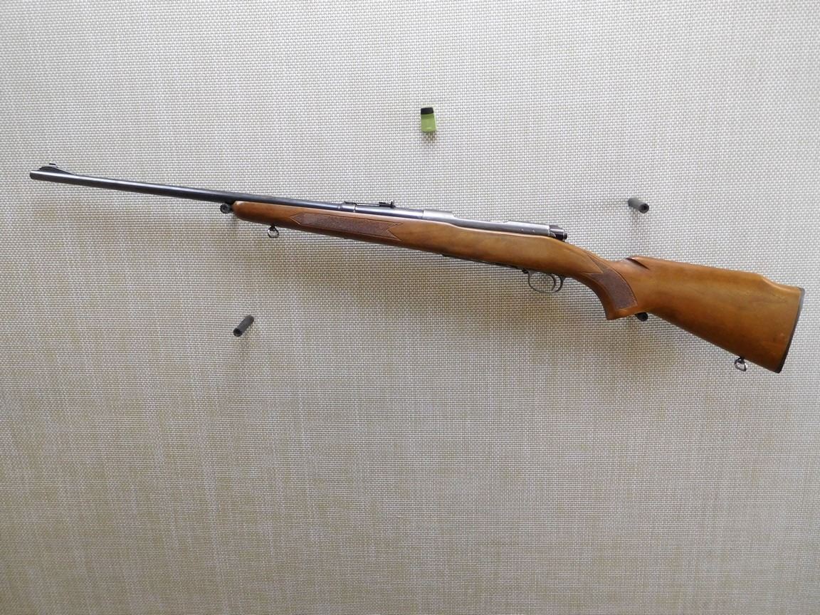 MANUFACTURED IN 1956, RAMP FRONT AND ADJUSTABLE REAR SIGHT, BORE IS VERY GOOD, SLING SWIVEL STUDS, CHECKERED FOREND AND SEMI PISTOL GRIP, HARD RUBBER BUTT PLATE, DRILLED AND TAPPED FOR SCOPE MOUNTS , BARREL LENGTH: 25" , SERIAL: 402906 , ACTION: BOLT ACTION REPEATER RIFLE , CONDITION: 7/10 , STOCK # 6920 , CLASS: CANADIAN NON RESTRICTED CLASS