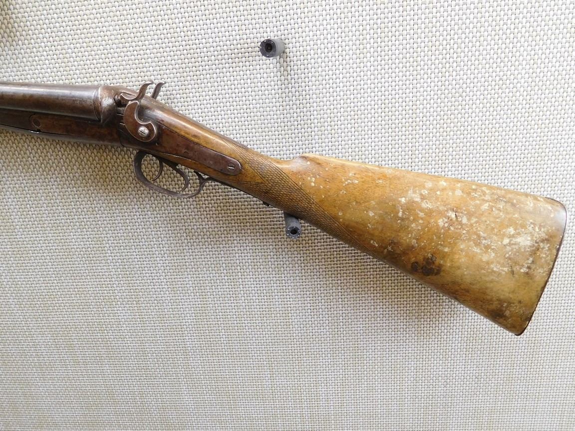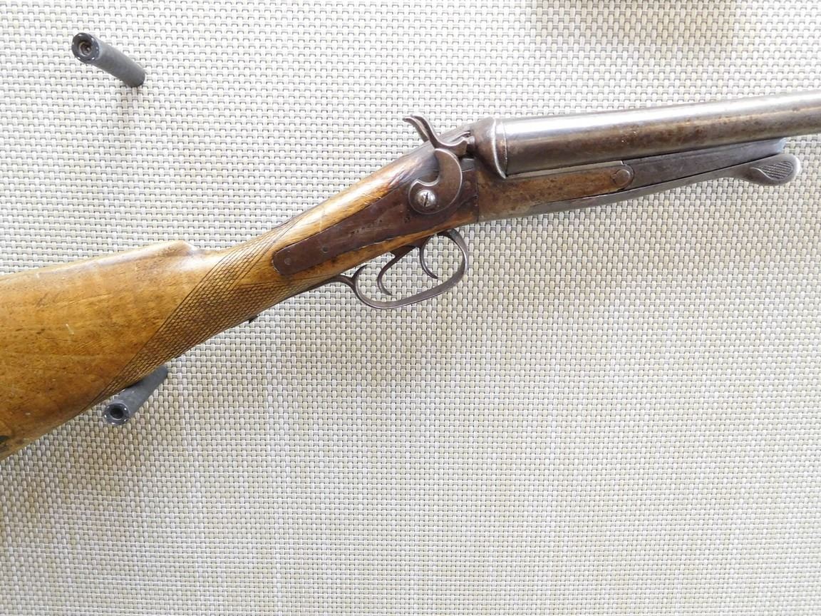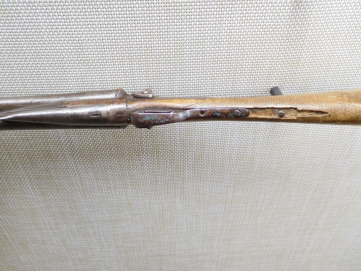 DARK BORES, CYLINDER BORE, CHECKERED STRAIGHT GRIP STOCK WITH STEEL BUTT PLATE , BARREL LENGTH: 30" , SERIAL: N/A , ACTION: SIDE BY SIDE UNDER LEVER OPENING WITH EXTERNAL HAMMERS SHOTGUN , CONDITION: 5/10 , STOCK # 6996 , CLASS: CANADIAN NON RESTRICTED CLASS