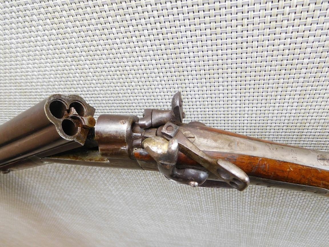 BARRELS ARE 2 RIFLED AND 1 SMOOTH BORE, IT IS MISSING THE FRONT SIGHT, REAR SIGHT IS PRESENT BUT MISSING THE ADJUSTOR, EXTERNAL HAMMERS, ONE HAMMER HAS BEEN REPLACED, THE OPENING LEVER HAS BEEN REPLACED, LOCK UP IS TIGHT,CRACK IN THE BUTT STOCK WITH A STEEL BUTT PLATE , BARREL LENGTH: 26" , SERIAL: N/A , ACTION: 3 BARREL DRILLING FIREARM , CONDITION: 5/10 , STOCK # 7007 , CLASS: CANADIAN NON RESTRICTED CLASS