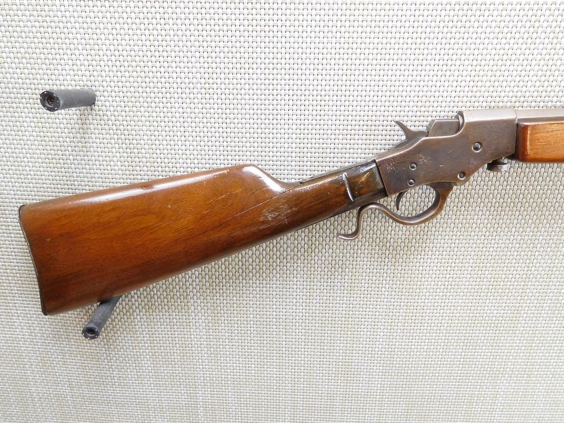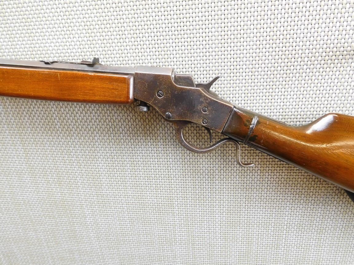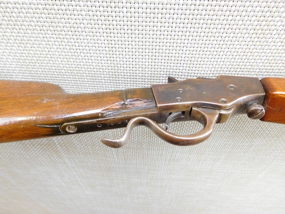 REPLACED FOREND, OCTAGONAL BARREL, BLADE FRONT AND ADJUSTABLE REAR SIGHT, BUTT STOCK IS CRACKED AND CHIPPED AT THE LOWER AND UPPER TANG, BORE IS DARK, STEEL BUTT PLATE , BARREL LENGTH: 24" , SERIAL: 0103 , ACTION: SINGLE SHOT FALLING BLOCK , CONDITION: 4/10 , STOCK # 7029 , CLASS: CANADIAN NON RESTRICTED CLASS