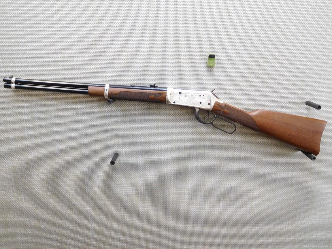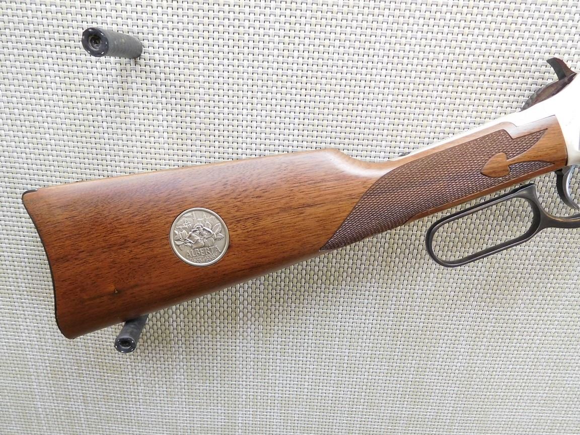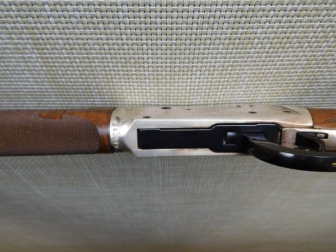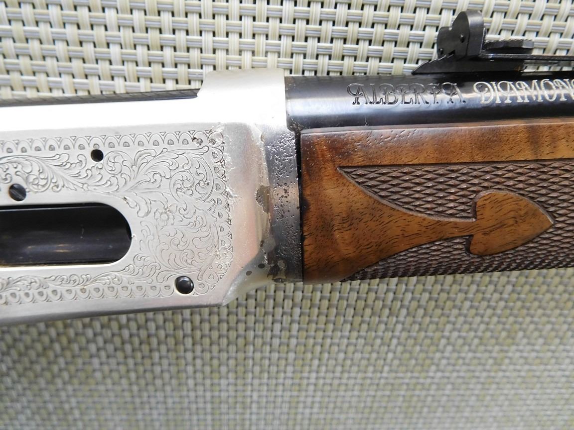 COMES WITH ORIGINAL BOX AND PAPERS, PREMIUM CHECKERED STOCKS, ADJUSTABLE METAL SIGHTS, FIREARM WAS STORED INCORRECTLY RESULTING IN MINOR CORROSION ON THE RECEIVER MAINLY AT THE FORESTOCK, AND ONE SPOT ON THE BARREL AT THE FOREND , UNFIRED , BARREL LENGTH: 20" , SERIAL: ADJ1237 , ACTION: LEVER ACTION RIFLE , CONDITION: 7/10 , STOCK # 7049 , CLASS: CANADIAN NON RESTRICTED CLASS