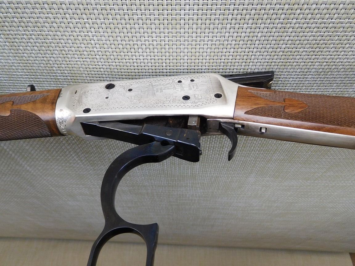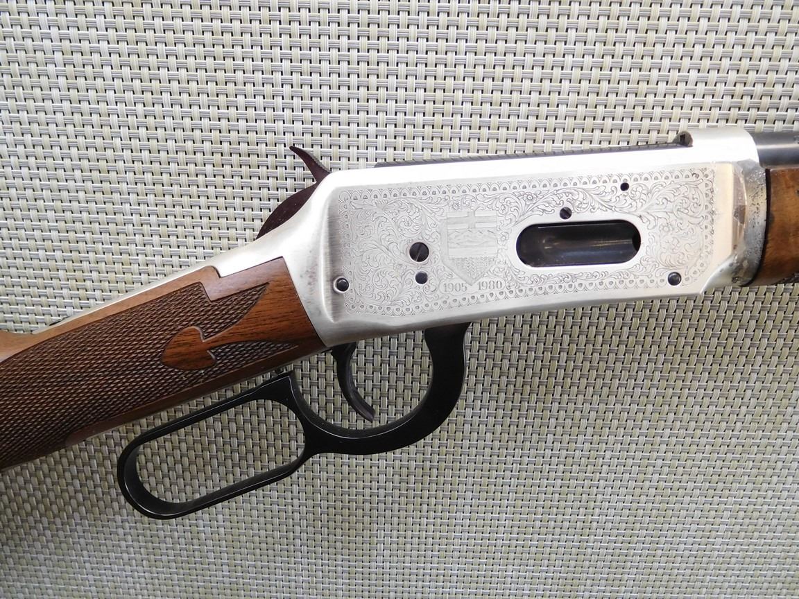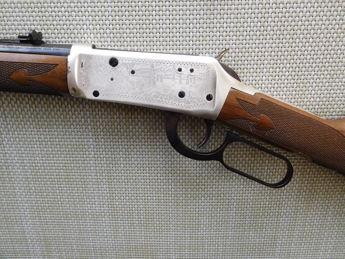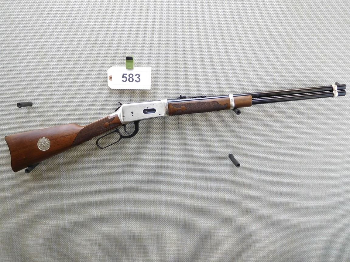 COMES WITH ORIGINAL BOX AND PAPERS, PREMIUM CHECKERED STOCKS, ADJUSTABLE METAL SIGHTS, FIREARM WAS STORED INCORRECTLY RESULTING IN MINOR CORROSION ON THE RECEIVER MAINLY AT THE FORESTOCK, AND ONE SPOT ON THE BARREL AT THE FOREND , UNFIRED , BARREL LENGTH: 20" , SERIAL: ADJ1237 , ACTION: LEVER ACTION RIFLE , CONDITION: 7/10 , STOCK # 7049 , CLASS: CANADIAN NON RESTRICTED CLASS