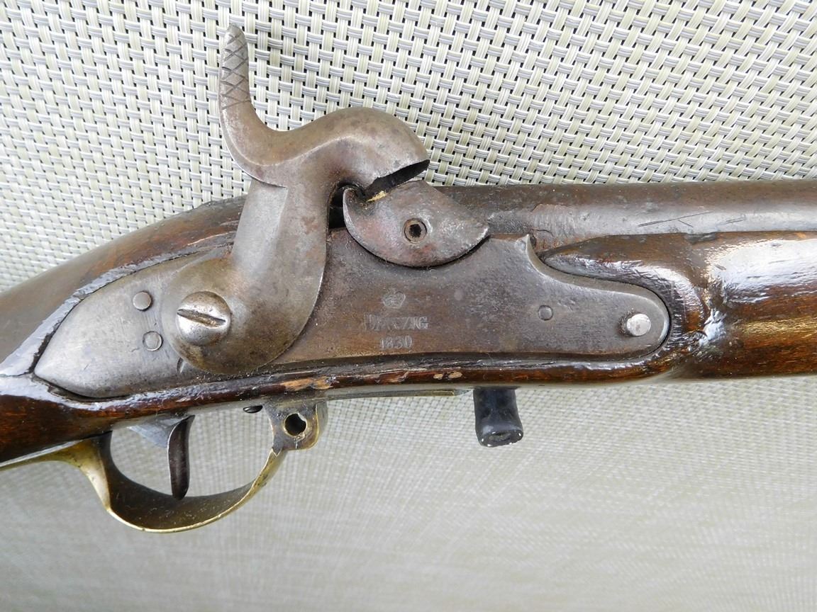 LOCK PLATE MARKED DANZIG (ARSENAL) 1830, NOTE 142823 IN UNION CIVIL WAR SERVICE, SMOOTH BORE, NOTCH AND BLADE SIGHT, BRASS BUTT PLATE NO 59/5LWR/5C MAY BE THE REGIMENTAL OR RACK #'S, SLING EYES, GREY PATINA, THERE IS NO NIPPLE, COCKS HOLDS AND FIREST, METAL RAM ROD, BRASS FOREND WITH BLADE SIGHT, BAYONET LUG , BARREL LENGTH: 1048MM , SERIAL: N/A , ACTION: MUSKET PERCUSSION , CONDITION: 7+/10 ANTIQUE , , CLASS: CANADIAN ANTIQUE CLASS