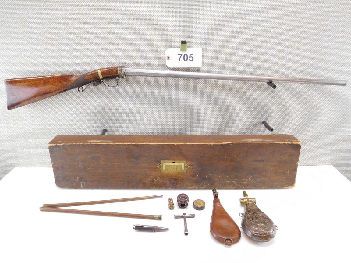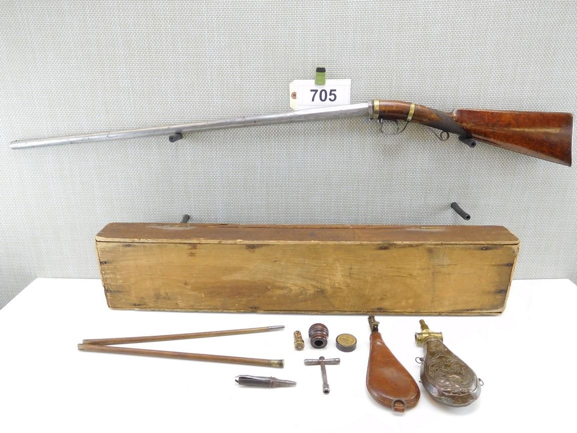 COMES WITH A CASE AND ACCESSORIES, SMOOTH BORE, REPAIRED ON LEFT TWO BRASS BANDS ON STOCK CHECKERED AT THE WRIST, NOTCH AND BEAD SIGHT, METAL BUTT PLATE, POLISHED STEEL FINISH, PERSONAL #'S ETCHED ON THE BOTTOM OF THE BARREL, BRITISH PROOFS , BARREL LENGTH: 29 1/2" , SERIAL: N/A , ACTION: SCREW BARREL PERCUSSION SHOTGUN , CONDITION: 5/10 ANTIQUE , , CLASS: CANADIAN ANTIQUE CLASS