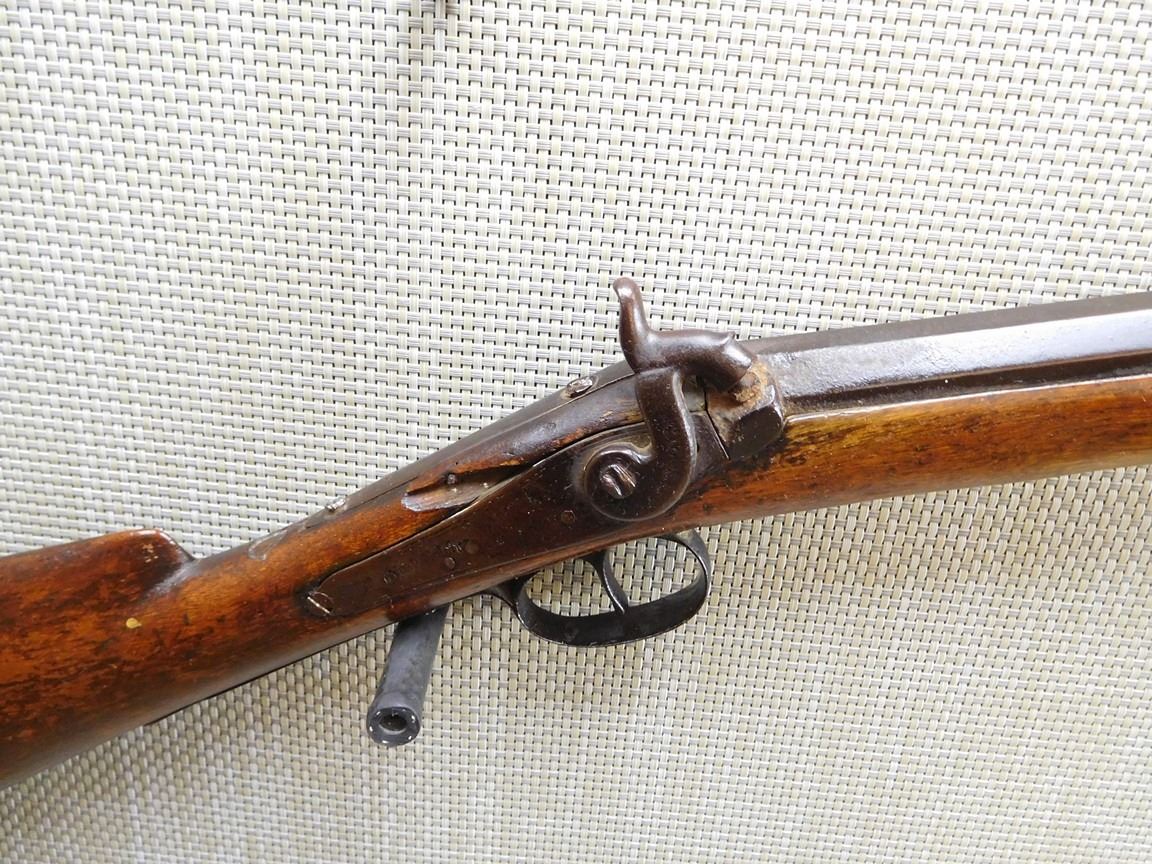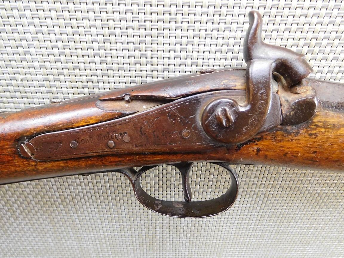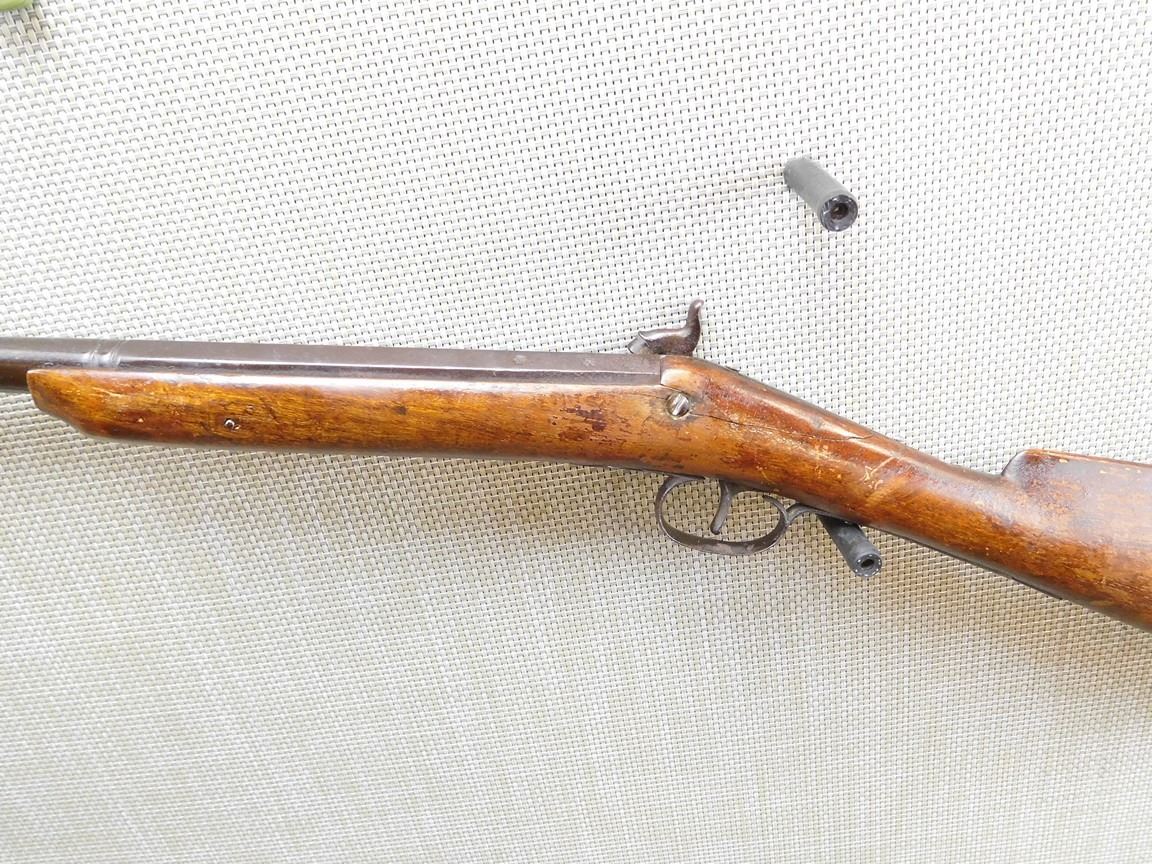 WOOD STOCK, BEAD SIGHT, METAL BUTT PLATE, BROWN PATINA, STOCK IS CRACKED , BARREL LENGTH: , SERIAL: N/A , ACTION: PERCUSSION SHOTGUN , CONDITION: 4/10 , , CLASS: CANADIAN ANTIQUE CLASS