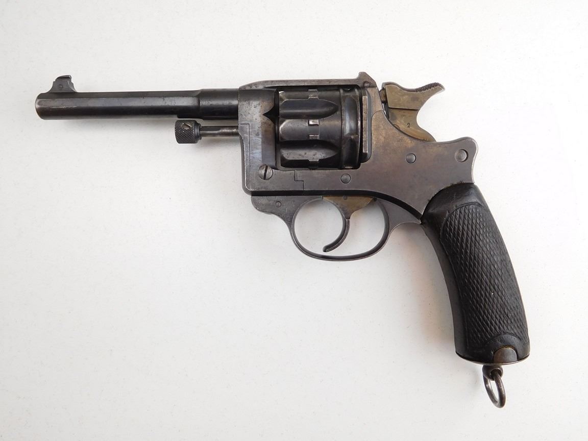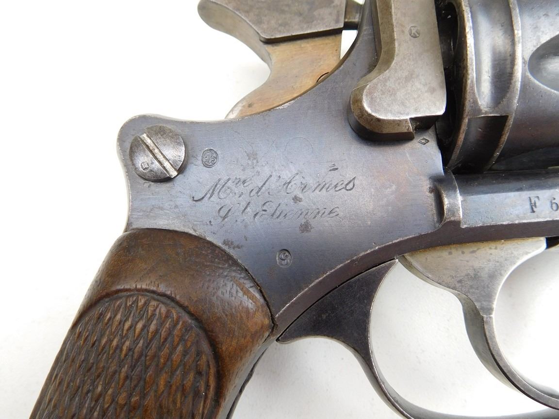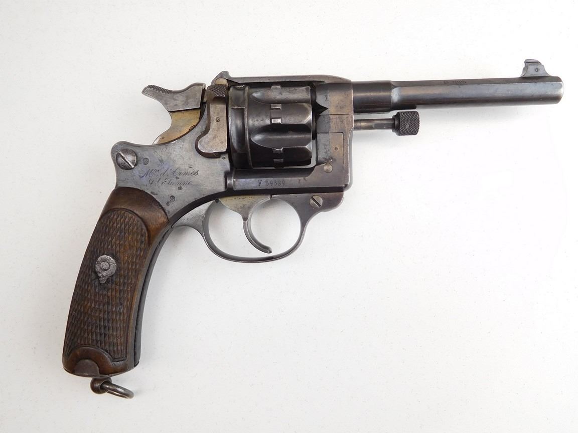 MANUFACTURED BY MAS, DATED 1895, NOTCH AND BLADE SIGHT, CHECKERED WOODEN GRIPS, LANYARD RING, HAS A GOOD BORE, LOCKS UP AND INDEXES WELL , BARREL LENGTH: , SERIAL: N/A , ACTION: REVOLVER , CONDITION: 7/10 ANTIQUE , , CLASS: CANADIAN ANTIQUE CLASS