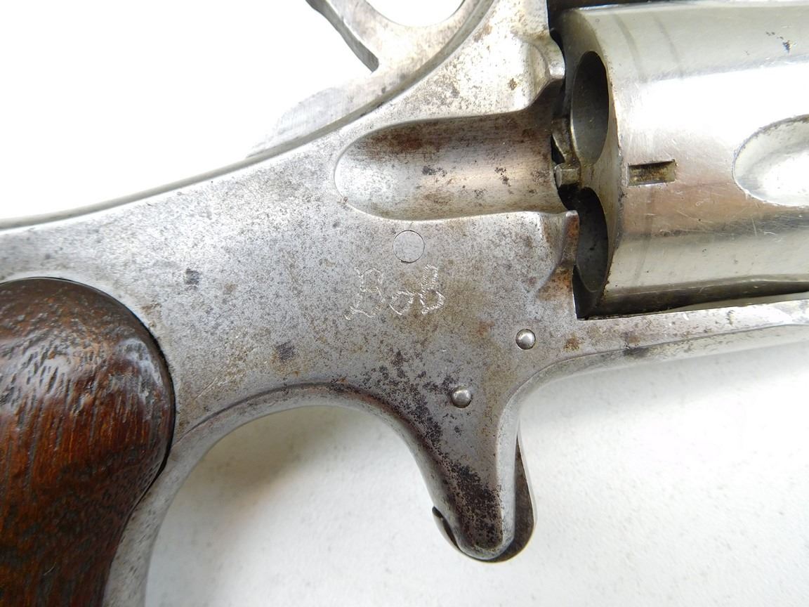 COCKS, INDEXES, HOLDS AND FIRES, OCTAGONAL BARREL, GOOD BORE, NOTCH AND BLADE SIGHT, PLAIN WOODEN GRIPS, FRAME SIGNED "BOB" , BARREL LENGTH: 76MM , SERIAL: 92 , ACTION: REVOLVER , CONDITION: 7/10 ANTIQUE , , CLASS: CANADIAN ANTIQUE CLASS