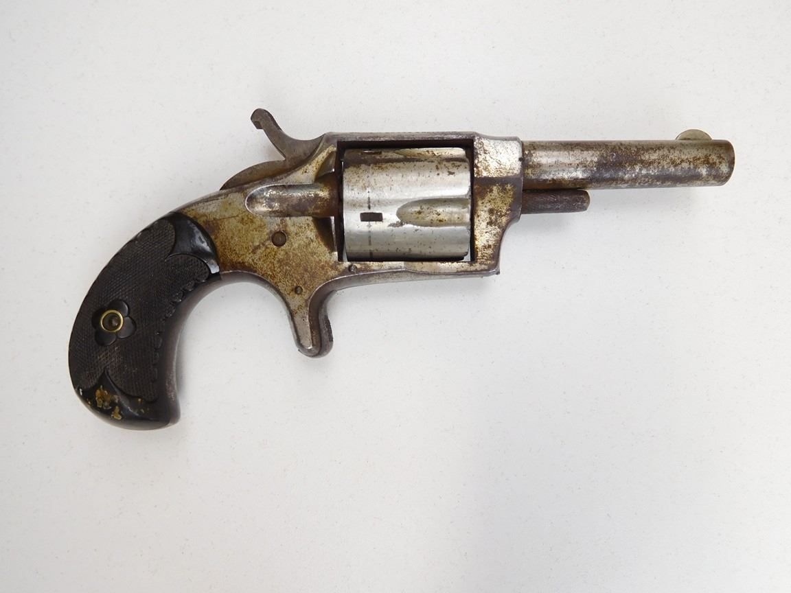 NOTCH AND BEAD SIGHT, CYLINDER PIN LOCK IS MISSING, HAS HARD RUBBER CHECKERED BIRDS HEAD GRIPS, COCKS AND HOLDS BUT DOES NOT INDEX , BARREL LENGTH: 68MM , SERIAL: 1767 , ACTION: REVOLVER , CONDITION: 4/10 ANTIQUE , , CLASS: CANADIAN ANTIQUE CLASS