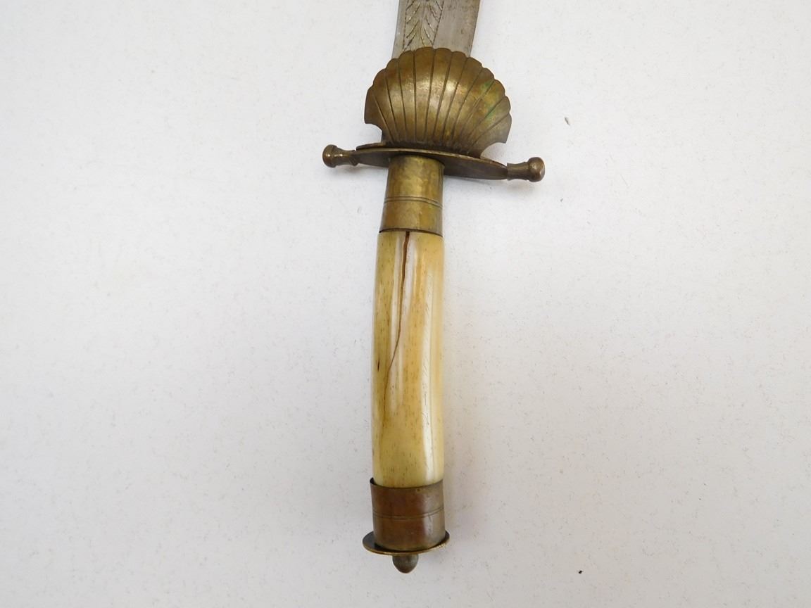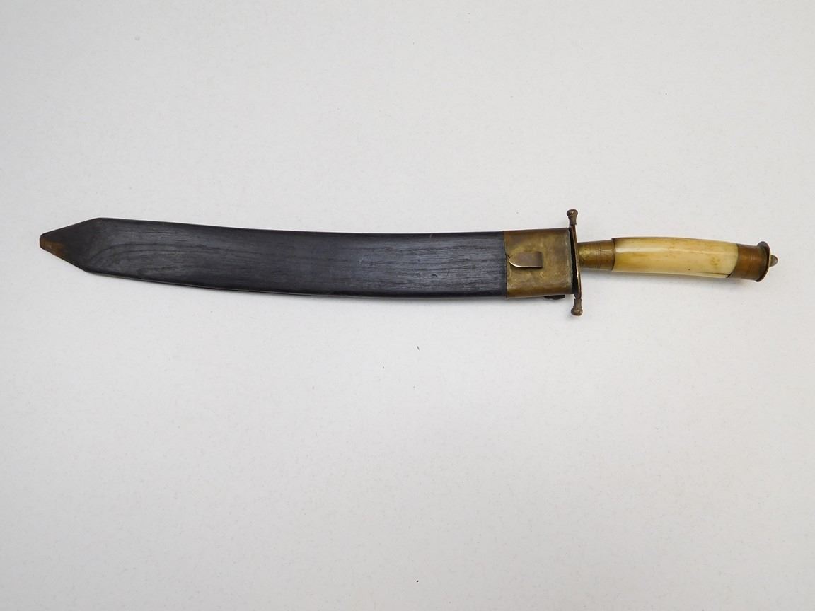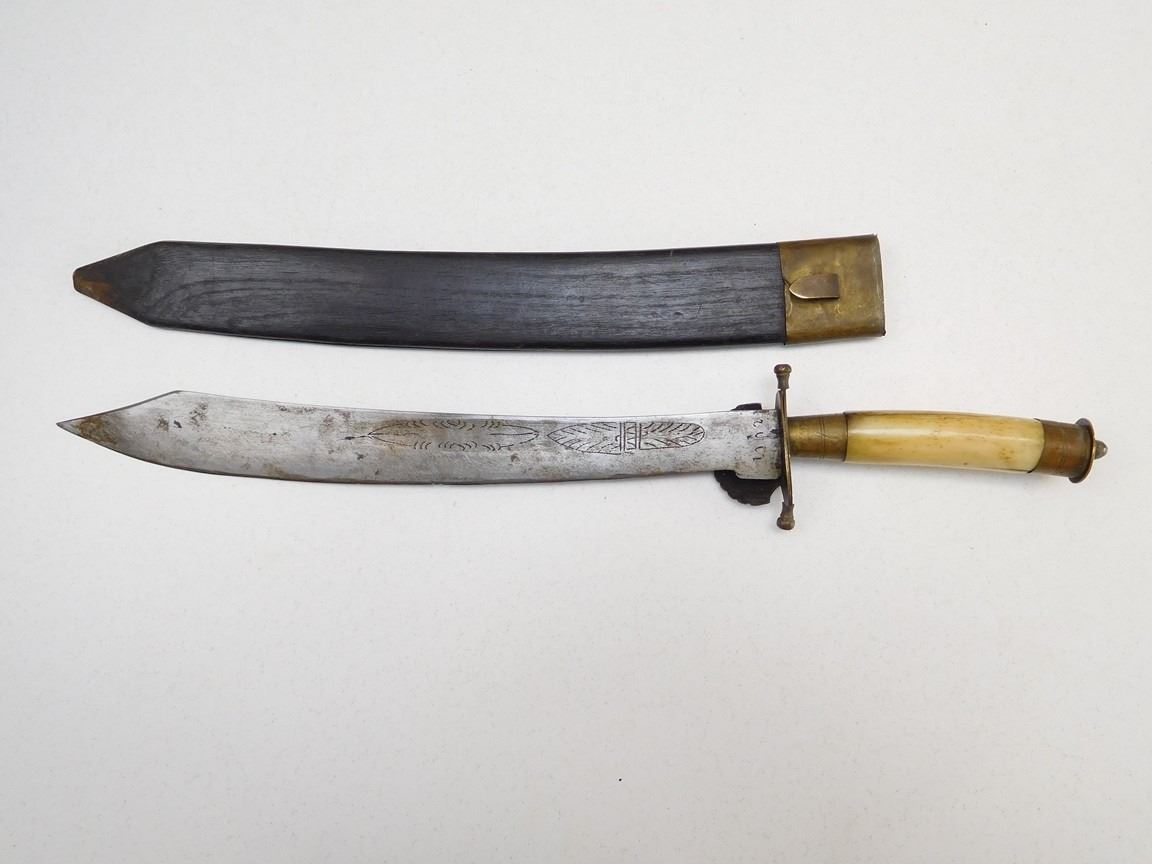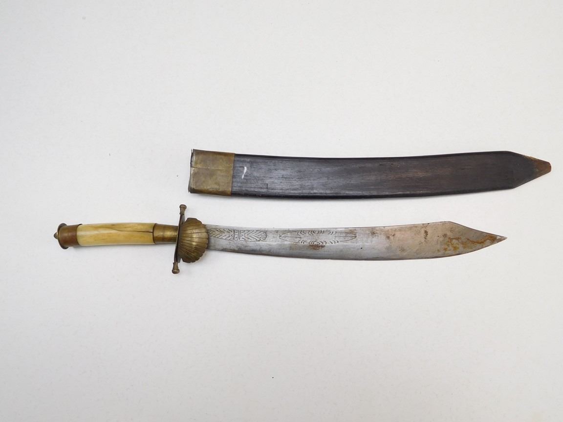 HAS BRASS AND BONE LIKE HANDLE , SOME ENGRAVING ON THE BLADE, SCABBARD HAS SOME DAMAGE AT THE ENTRANCE FOR THE BLADE
